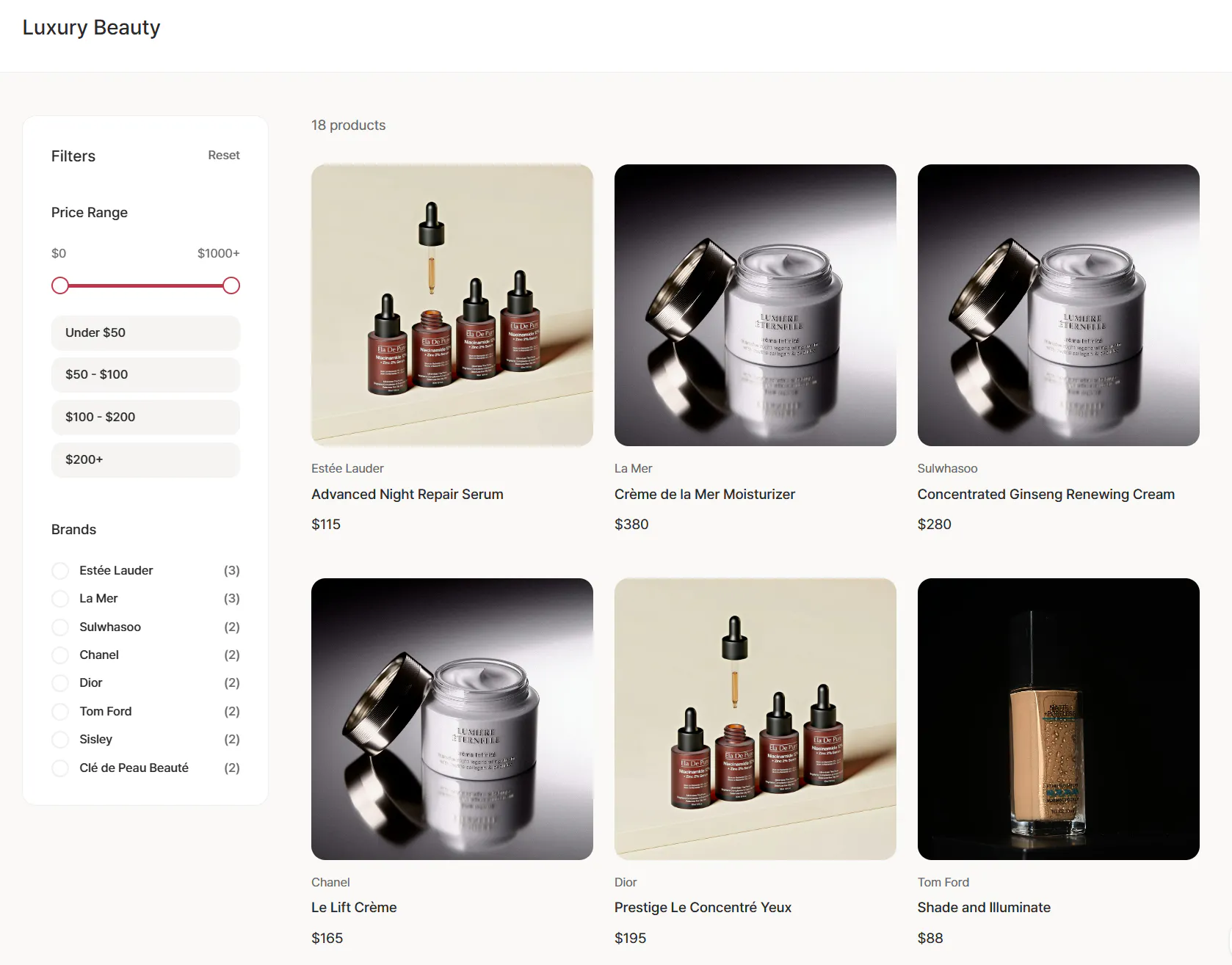 Pencil MCP가 만들어준 결과는 다음과 같아요. 컴포넌트도 잘 구분되고, 잘 표현해줬어요. 안에 들어가는 화장품 이미지들이 원본이랑 달라서 고급스러운 느낌이 좀 덜하긴 하지만, 그건 사진을 교체하면 되니까 상관없구요