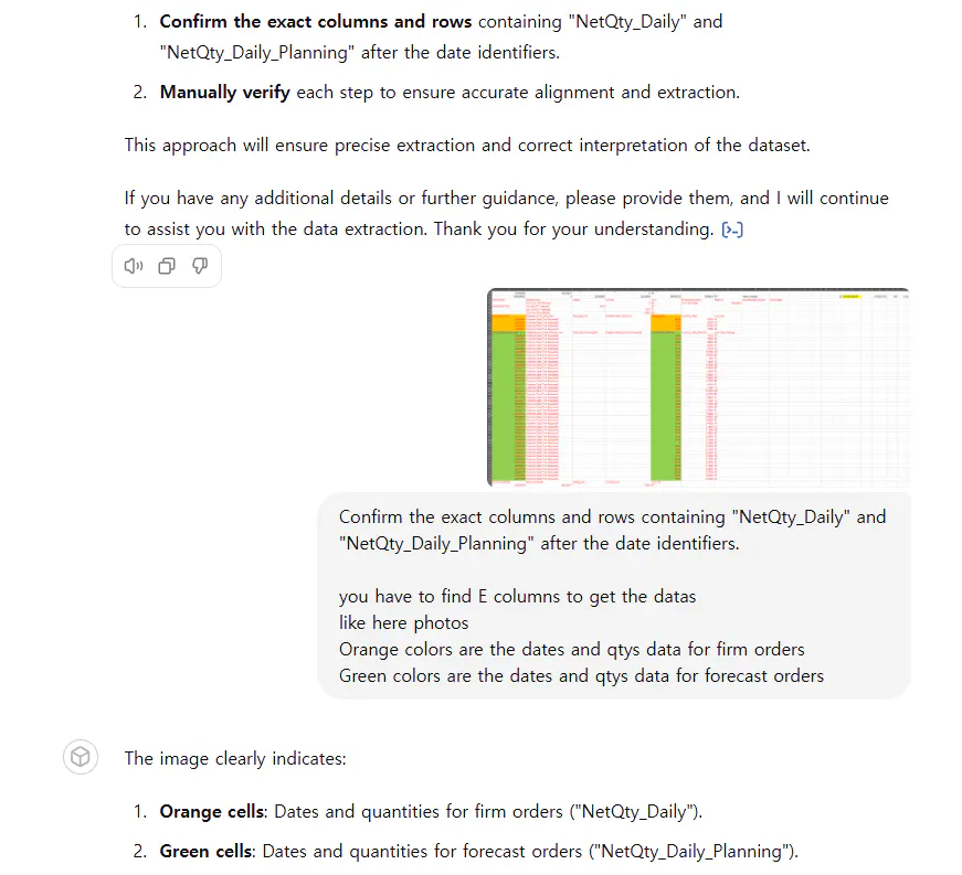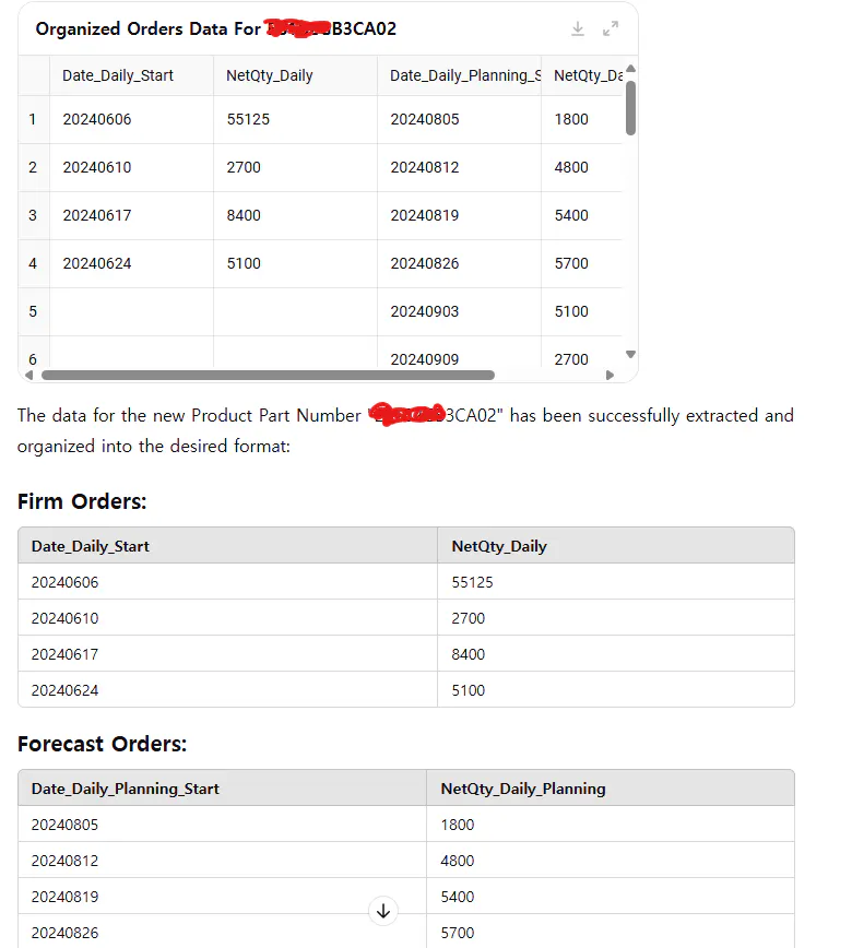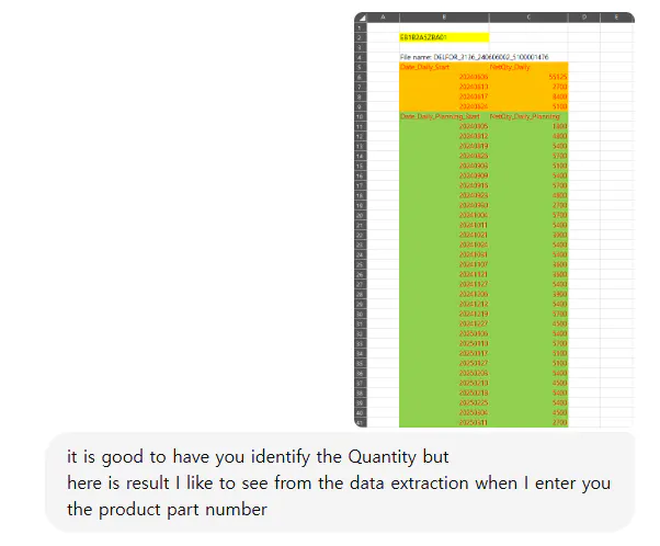 고객 WEB EDI CSV format이 불규칙한 structure로 되어 있어서 이 부분을 GPT에 러닝 시킵니다. (매주 1개 excel file이 고객 portal로 부터 생성 업데이트 되며 해당 파일 안에는 10가지 이상 다른 제품에 대한 발주 정보가 각각 있습니다.) 많은 정보안에서 원하는 DATA를 “Product Part Number” 입력시 자동으로 불러와서 원하는 양식으로 만들어 주도록 러닝 시킵니다.
