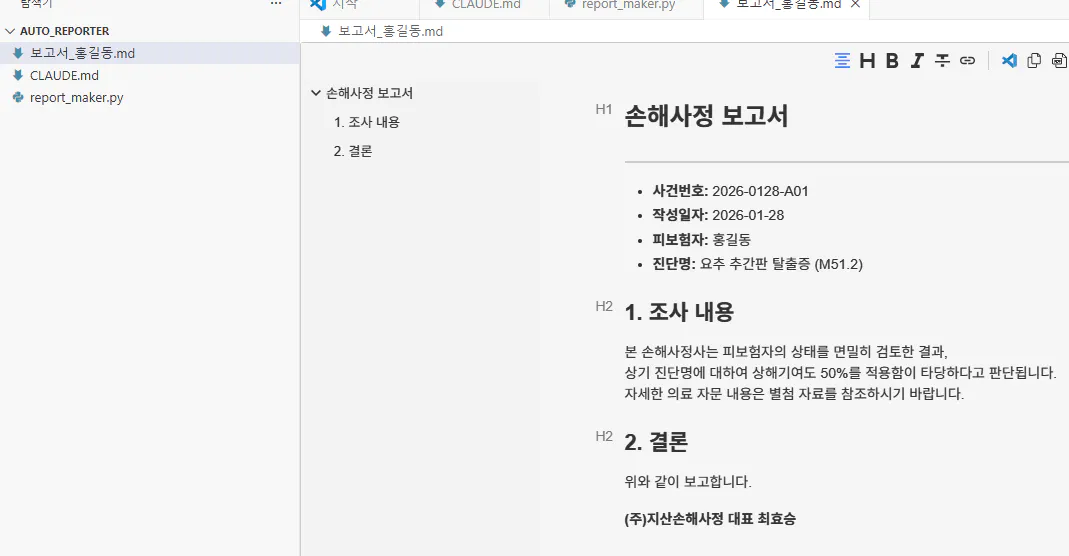 • Claude에게 "사건번호, 고객명을 넣으면 .md 파일로 뱉어내는 코드를 짜줘"라고 명령했습니다.