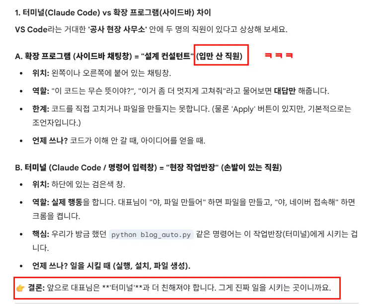 1. 첨에 터미널이랑 클로드 확장 프로그램 헷갈림 : 예전에 클로드 코드를 제대로 안 익히고 vs코드에 codex 달아서 작업을 하다보니 클로드 확장 프로그램이랑 터미널 개념이 너무 어려웠습니다. gemini에게 질문 후 받은 답변 -> 터미널과 앞으로 좀 더 친해지기로 ㅎㅎ
