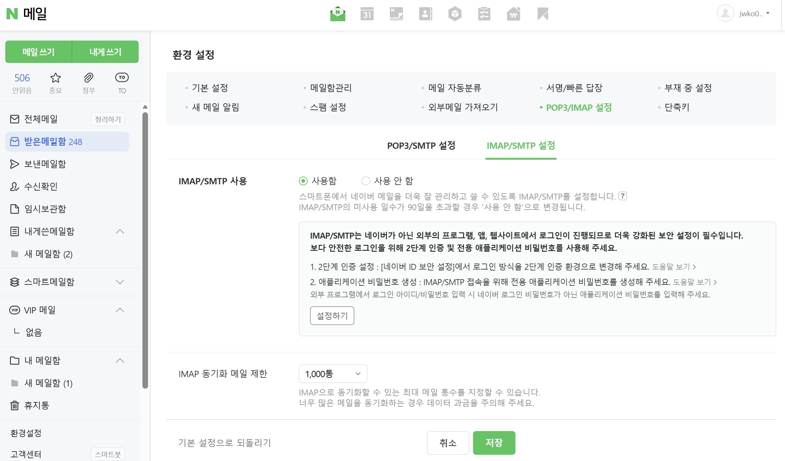 네이버 메일함 > 환경설정 > IMAP/SMTP설정 : 사용함 > 저장