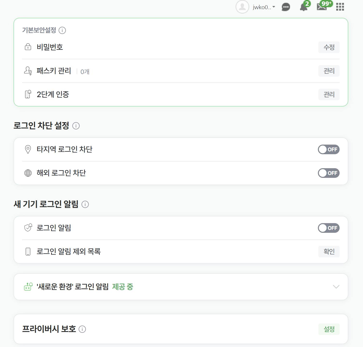 로그인 차단 설정 > 타지역 & 해외 로그인 차단 => OFF
