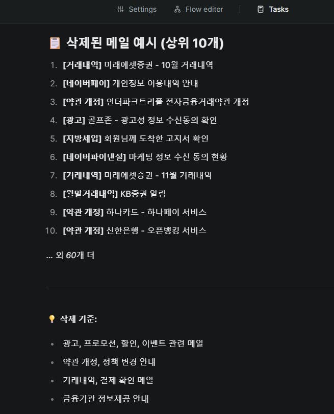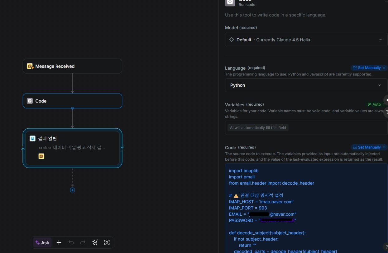 패스워드는 5번에서 생성한 앱 비밀번호를 넣음(중요)광고성 & 특정 발신자 메일 삭제
