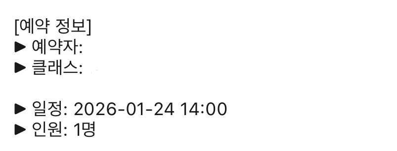 카톡 알림톡: 플랫폼에서 오는 예약 확정 메시지 내용 (이름, 날짜, 인원 등이 보이는 부분)