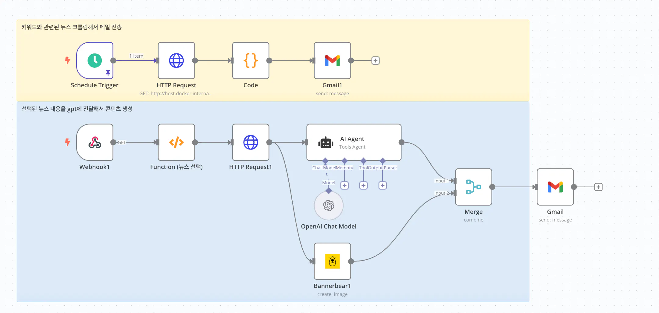 뉴스기사를 크롤링해서 메일로 보내주는 워크플로우에 이어서, 메일에서 선택한 기사의 내용을 인스타그램 콘텐츠로 자동 생성해주는 워크플로우를 n8n으로 구현했습니다.