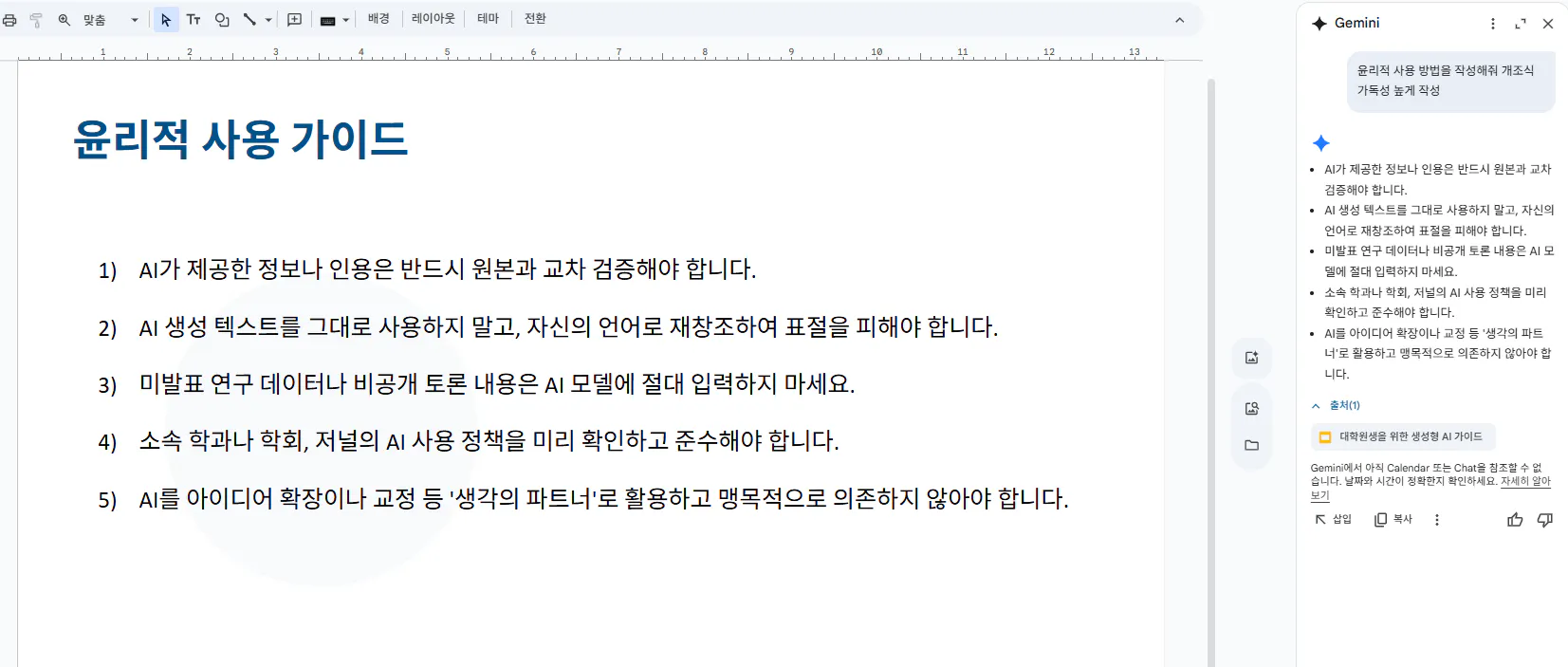 윤리적으로 문제가 될 만한 부분(출처, 투명성, 과의존 등)을 미리 고민하고 가이드라인을 제시하는 것이 중요하다는 것도요.