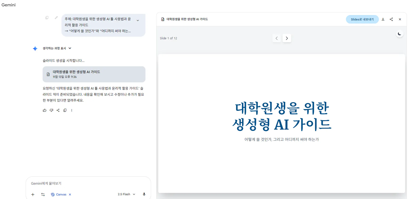 Gemini로 초안 작성: 발표 주제에 맞춰 구조와 주요 메시지를 작성했습니다. Gemini의 자연어 정리 기능을 활용해 발표용 개요를 빠르게 정리할 수 있었습니다.
