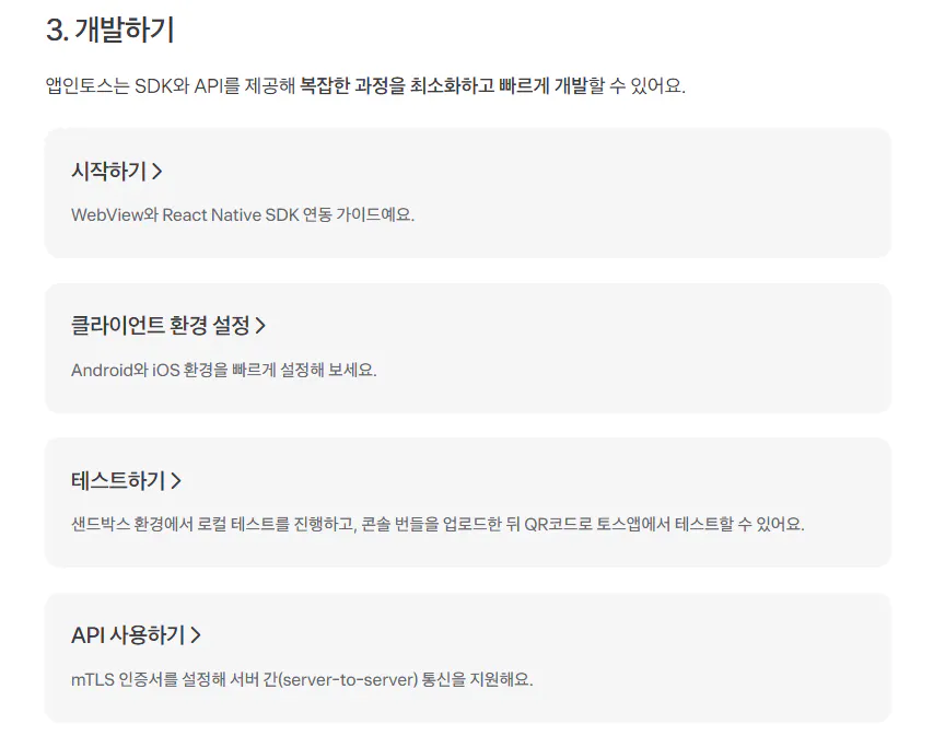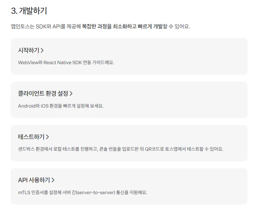 앱인토스는 SDK와 API를 제공해 **복잡한 과정을 최소화하고 빠르게 개발**할 수 있어요.