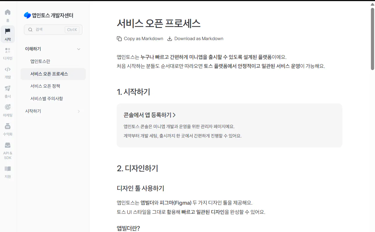 description: '앱인토스 미니앱 서비스 오픈 프로세스를 단계별로 안내합니다. 콘솔 등록부터 디자인, 개발, 검수, 출시까지 전 과정을 확인하세요.'