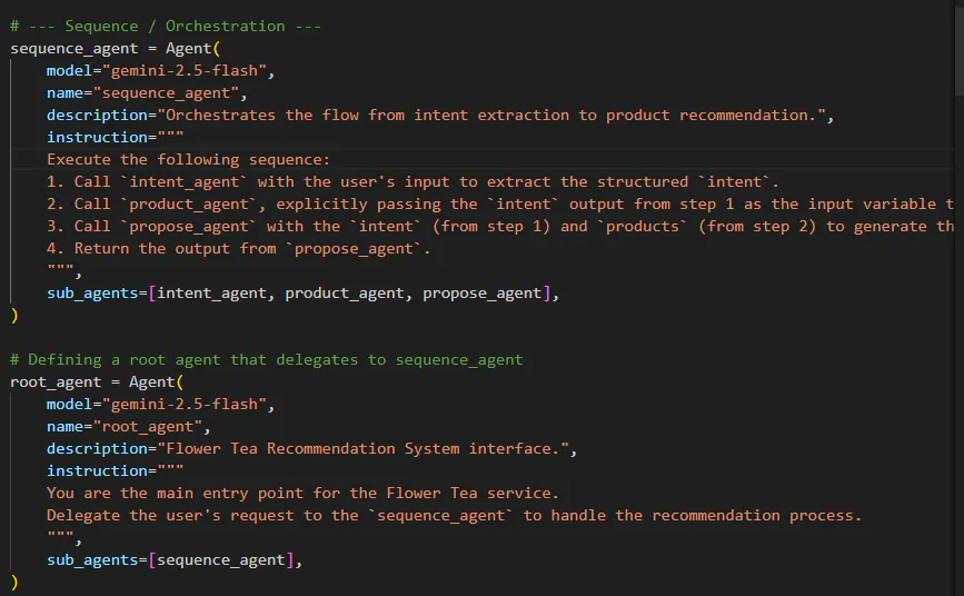https://github.com/google/adk-docs/tree/main/docs 참조 해서 agent 코드를 작성하라고 함sequence agent로 처음에는 연결하지 않길래 연결해 달라고 요청함.