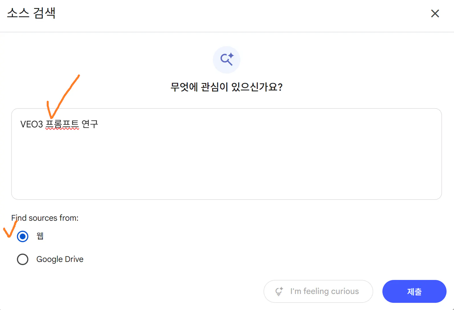 Tip: 노트북 LM을 사용하여 검색 기능을 통해 VEO 프롬프트 가이드라인을 얻고자 하였습니다.