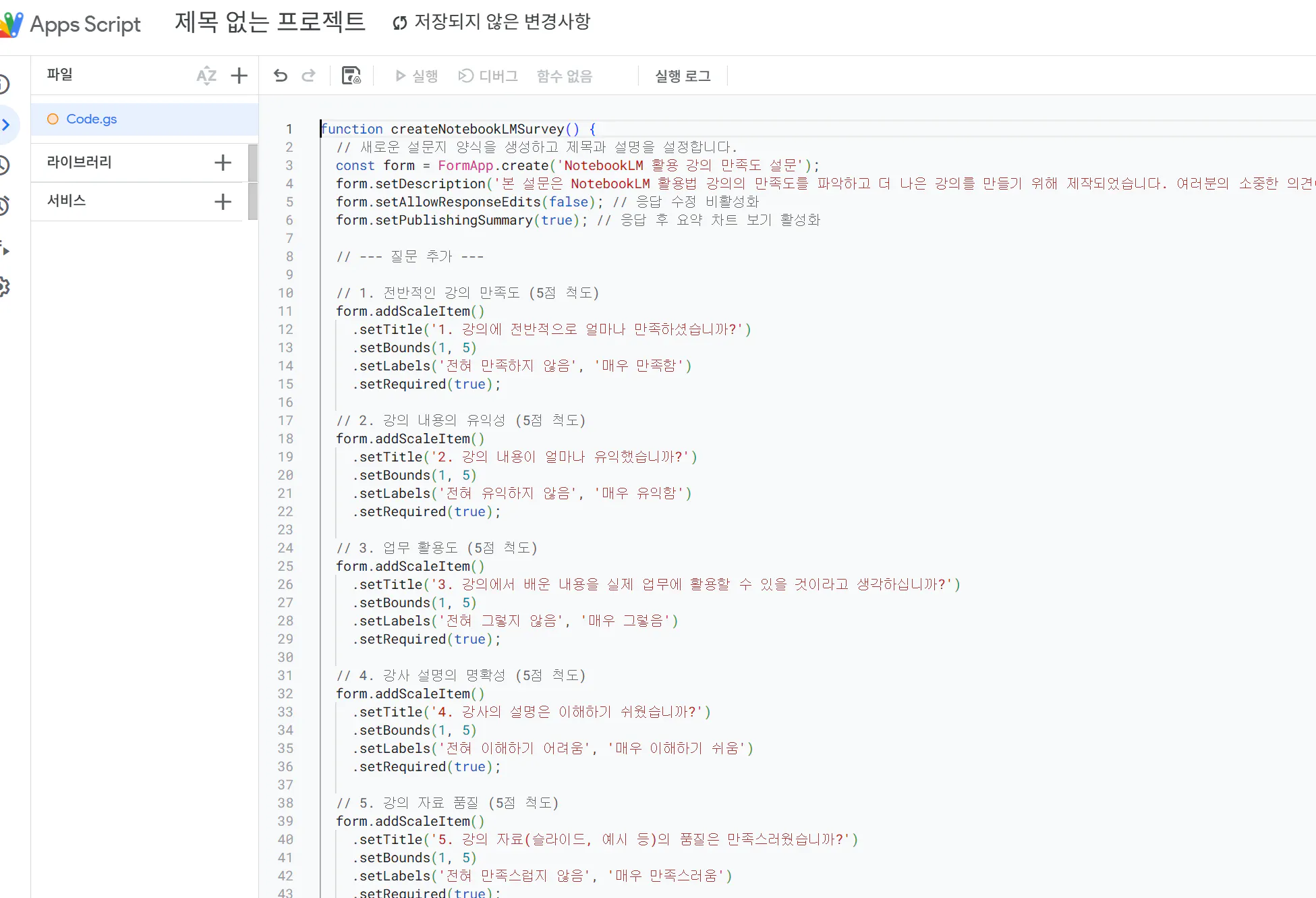 트레이너지원서류에 들어갈 구글 설문지를 작성하려고해.notebooklm해서 다른 사람들에게 설명하는 강의안을 만들었어. 이 강의에 대한 강의만족도 조사를 실시하는 구글앱스스크립트 코드를 만들어줘문항수는 10개 정도로 만들어줘 개인정보 관련한 항목은 넣지마 주관식없이 작성