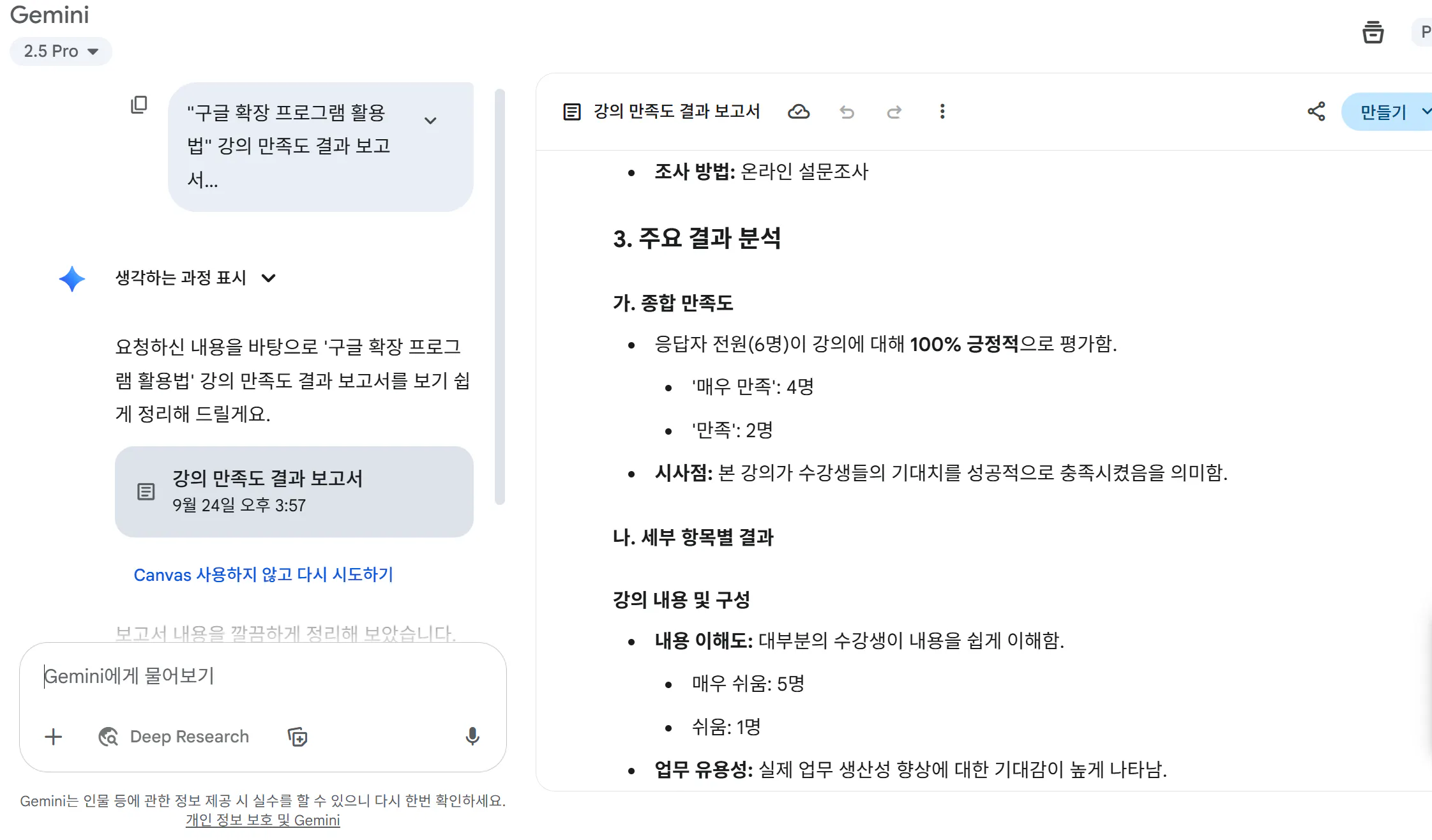 제미나이 보고서 작성 시에는 “데이터 요약 → 핵심 인사이트 → 시각 자료 요청” 순서로 프롬프트를 주면 결과물이 더 구조화됩니다.
