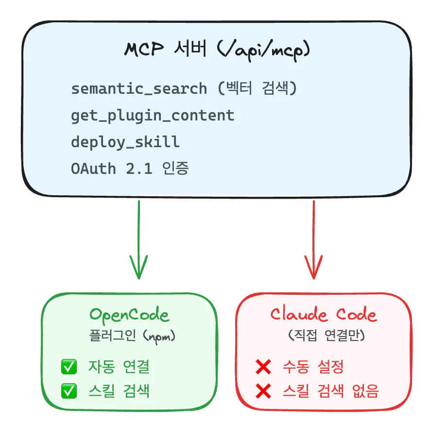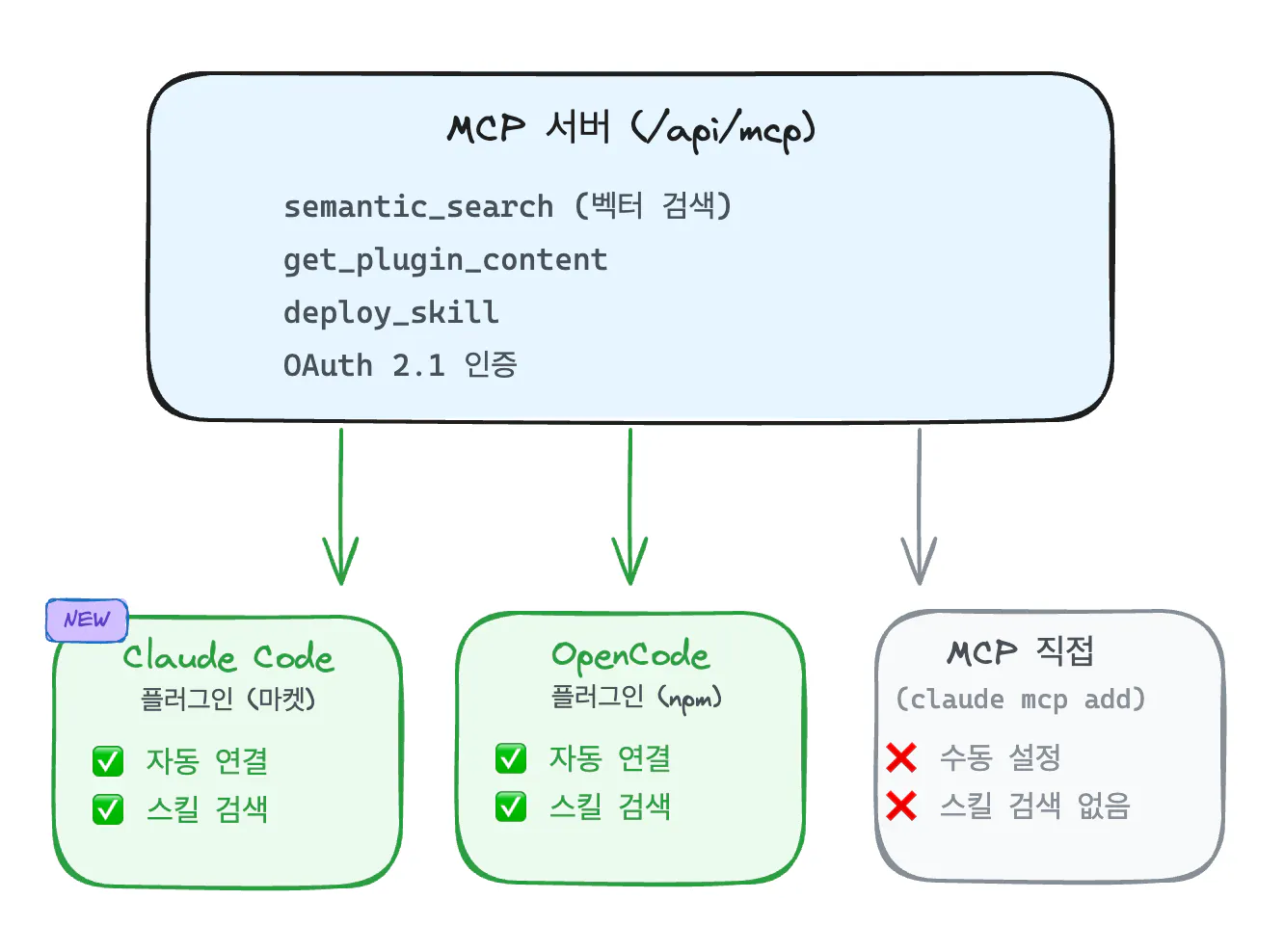 문제는 Claude Code 사용자였습니다. 플러그인이 없으니 claude mcp add 명령어로 직접 MCP 서버를 등록해야 했고, 스킬 자동 검색도 없었습니다. 도구마다 온보딩 경험이 달랐던 거죠.