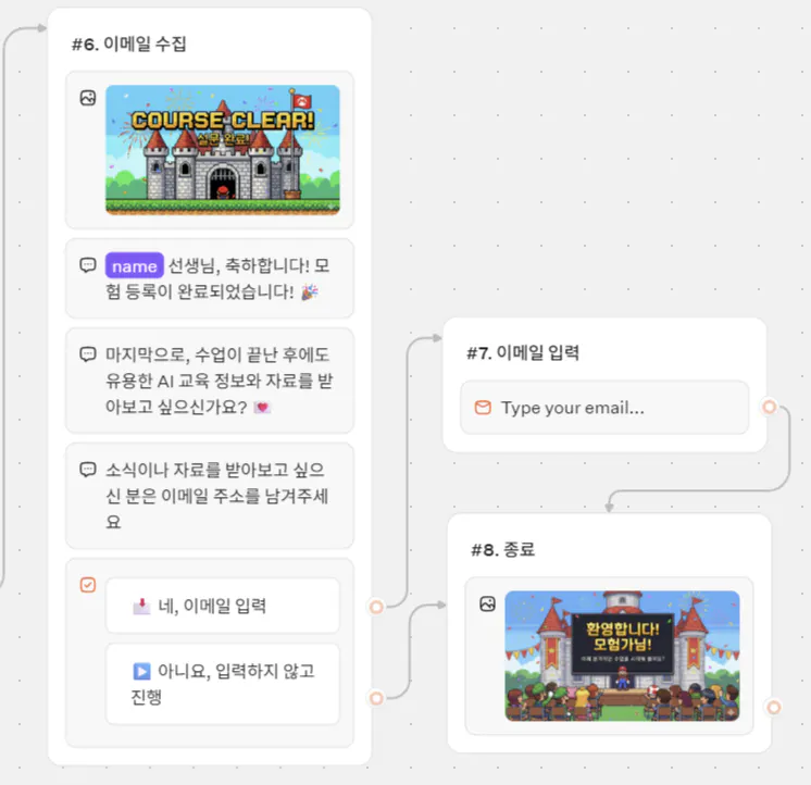 대신 “이메일을 남기겠냐 → (예) 입력 → 종료 / (아니오) 종료”처럼 대화 흐름으로 설계하면 불편함을 줄일 수 있었다.