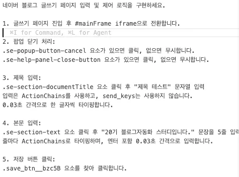 프롬프트 2를 통해 자동 로그인 후 예시 글까지 작성 되는 것 확인 함. 자동 저장까지 되는 거 확인 완료