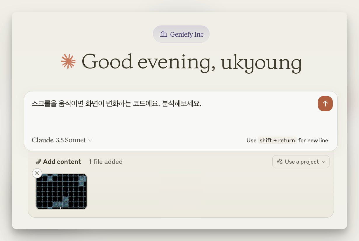우선은 GIF 파일을 넣고 스크롤을 움직일 때 마다 화면이 바뀌는 코드를 분석해달라고 했습니다. 그런다음 이를 구현해달라고 부탁했어요.