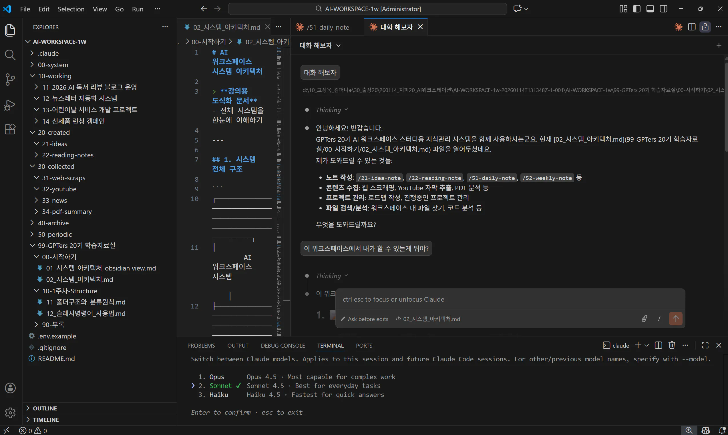 Claude Code는 설치되었고 VS Code도 연계되어 있었지만, 그 이후로 중지 상태였습니다. 스터디 1주차 동영상 다시보기 하면서 Claude와 VS Code에게 직접 질문해 보면서 가능한 기능을 실험해보고자 했습니다.