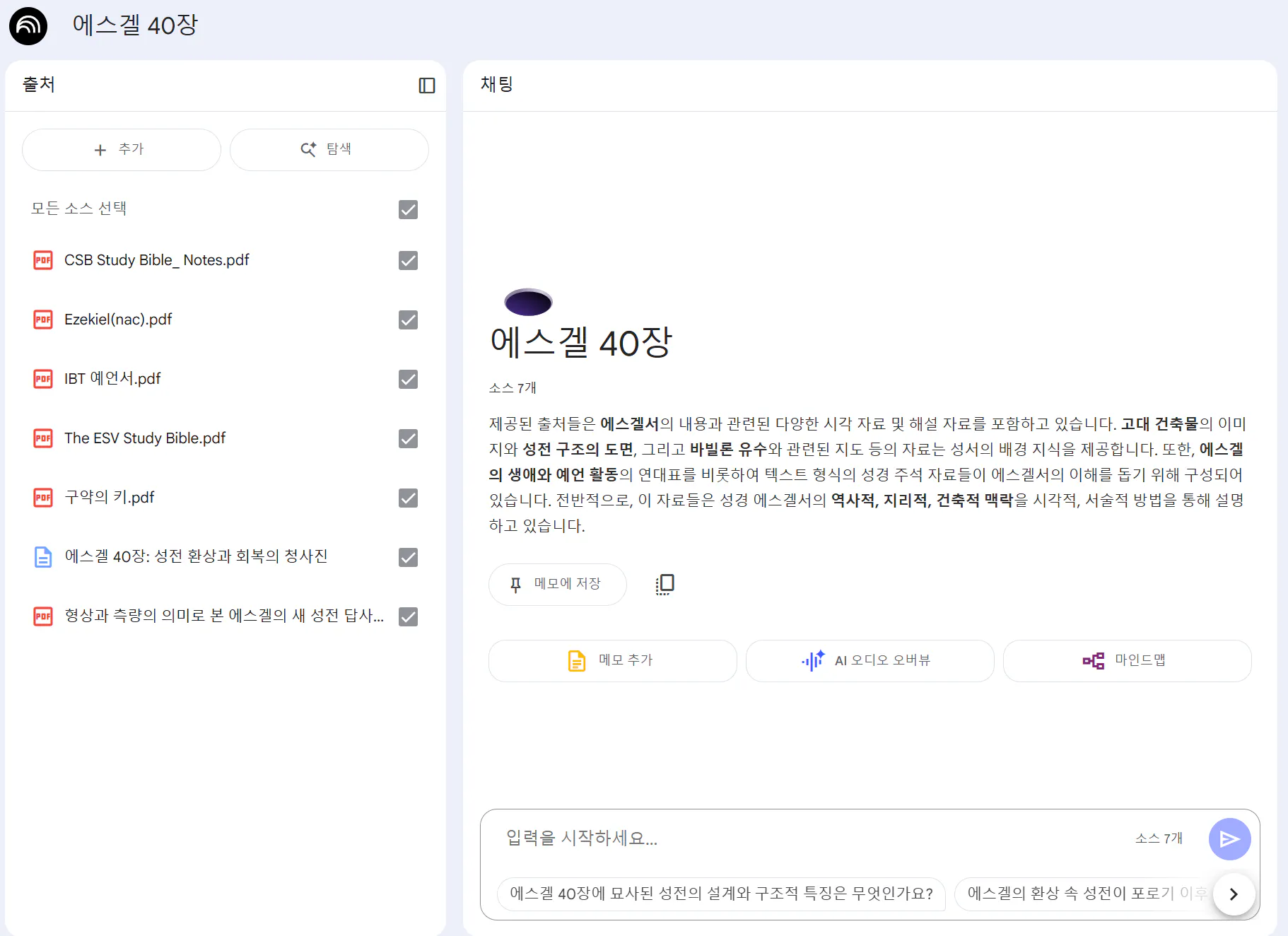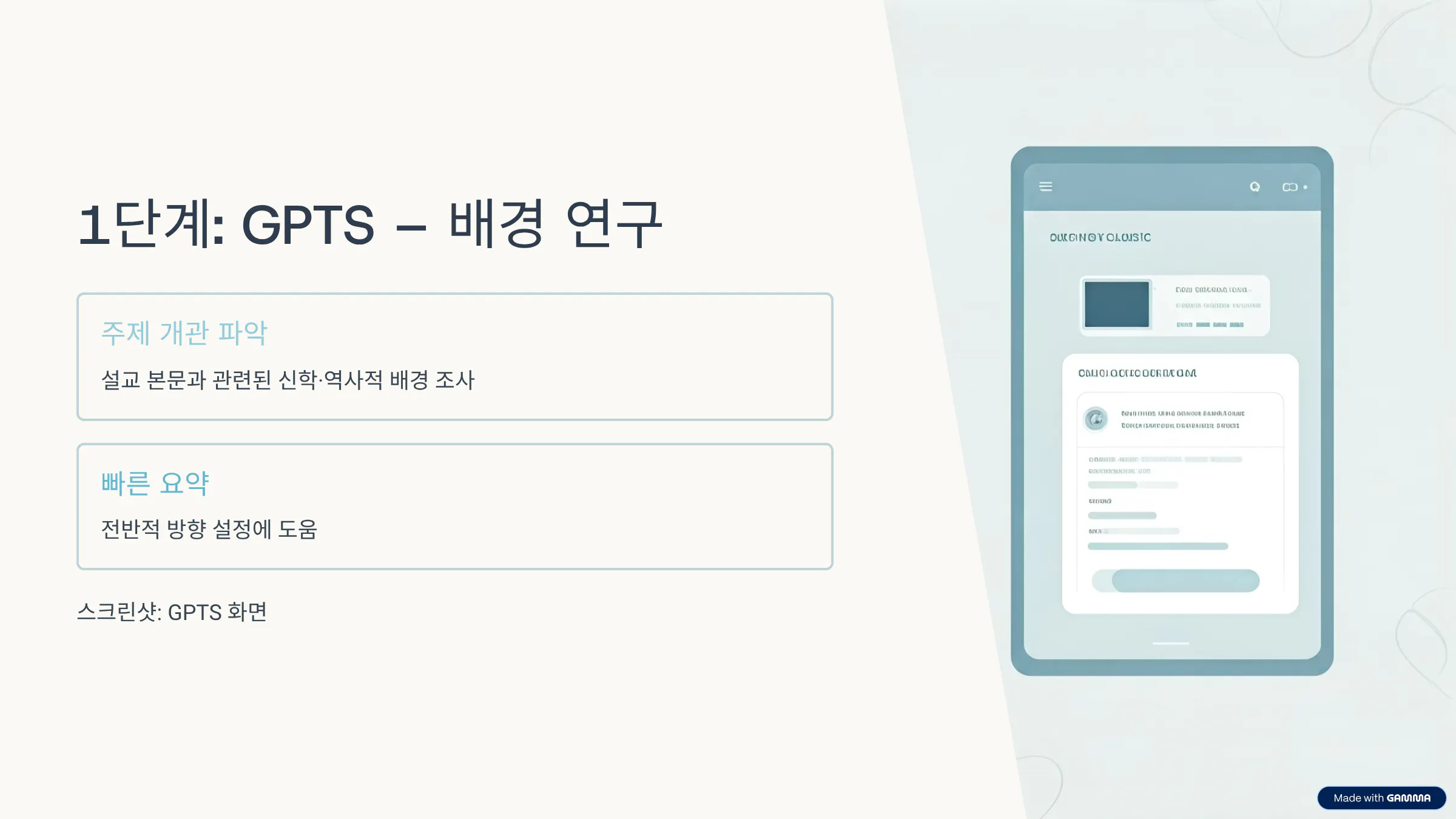 사실 처음엔 수업 주제에 맞춰 논문 준비를 해보려 했지만, 저는 아직 대학원 입학 시기도 정하지 못한 상황이었습니다. 그러다 보니 지금 당장 제가 매달 맞닥뜨리는 실질적인 과제인 설교 준비에 AI를 본격적으로 활용해보기로 마음을 먹었습니다.