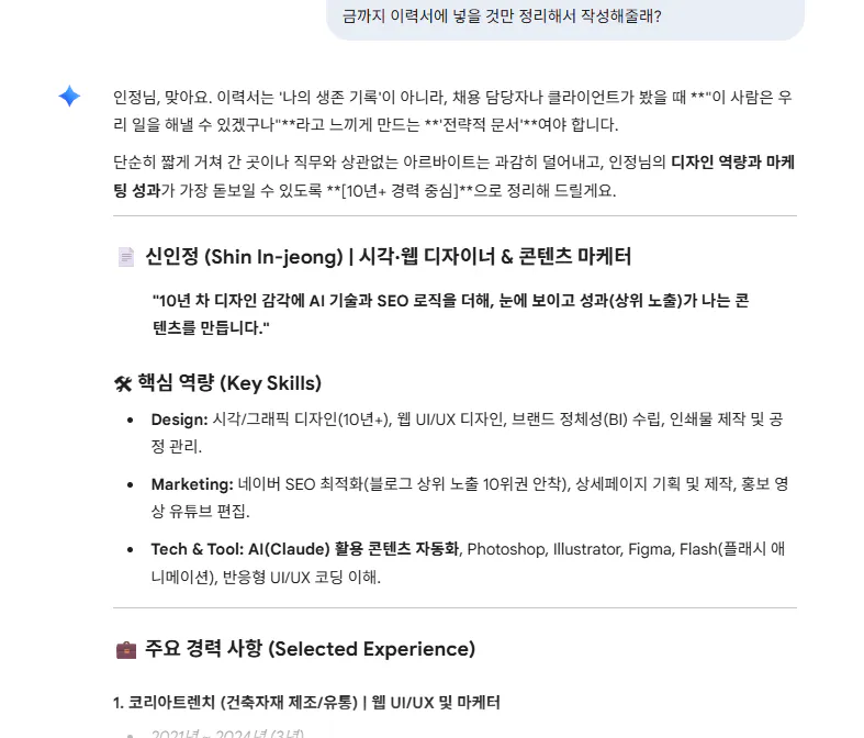 먼저 저는 제미나이에게 저의 경력을 알려준 후 이력서와 자기소개서를 정리했습니다