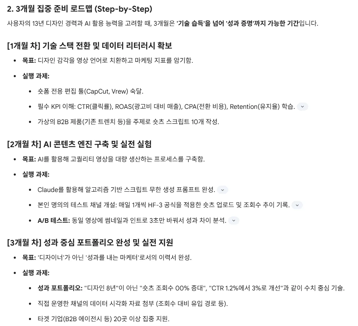 제가 일일이 조사하지 않아도 AI가 그 많은 자료를 스스로 가져와서 정리하고 취합한 후 내가 원하는 질문의 답변을 하는 것에 놀라웠습니다. 그리고 그에 맞는 로드맵까지 계획도 해줘서 좋았습니다. 하지만 하다보니 제가 원하는 직무가 유튜브 마케터인지에 대한 의문이 생겼습니다. 좀더 제가 원하는 직무에 대해 확인하고 나에게 맞는지 탐색한 후 다시 시도해 봐야 겠다는 생각이 들었습니다.