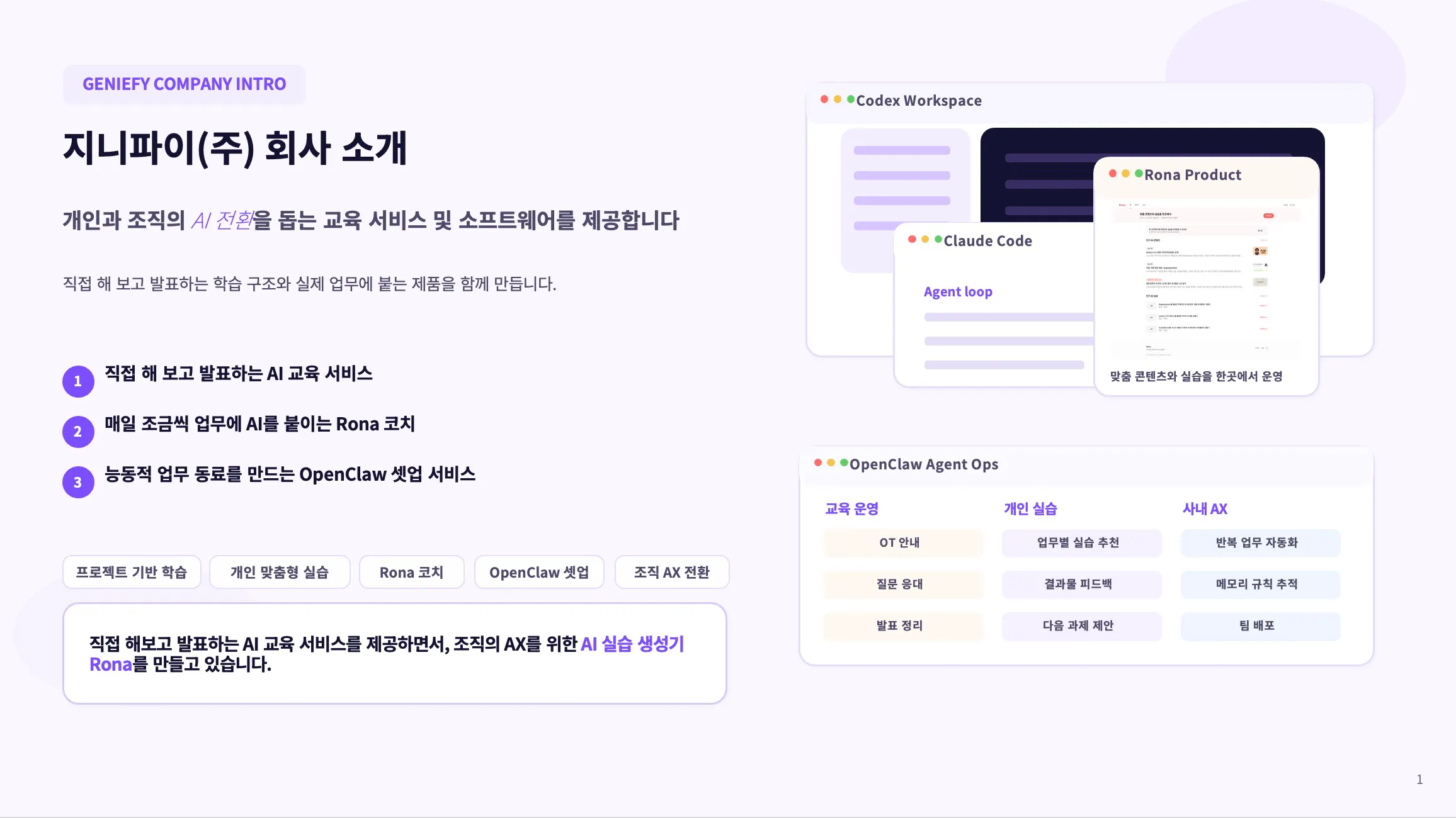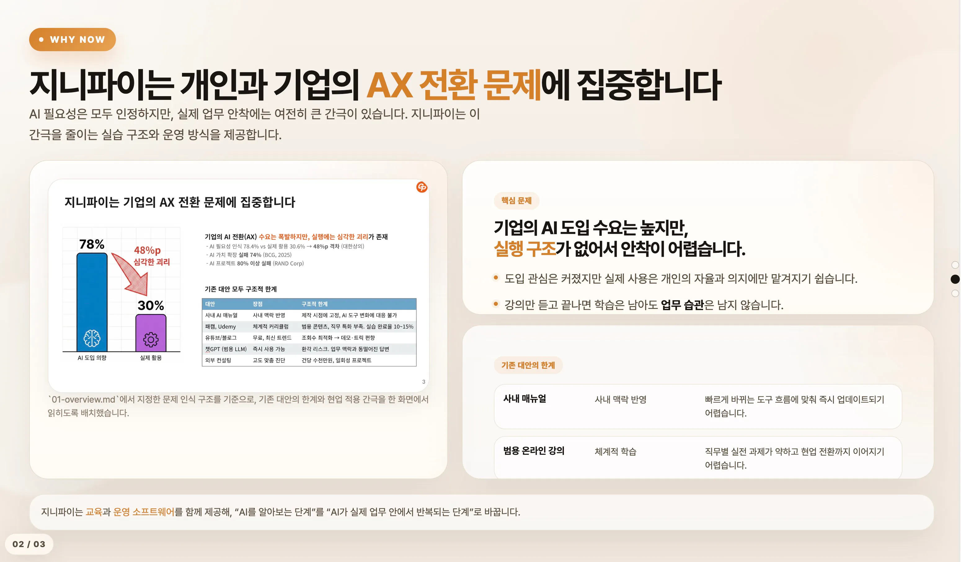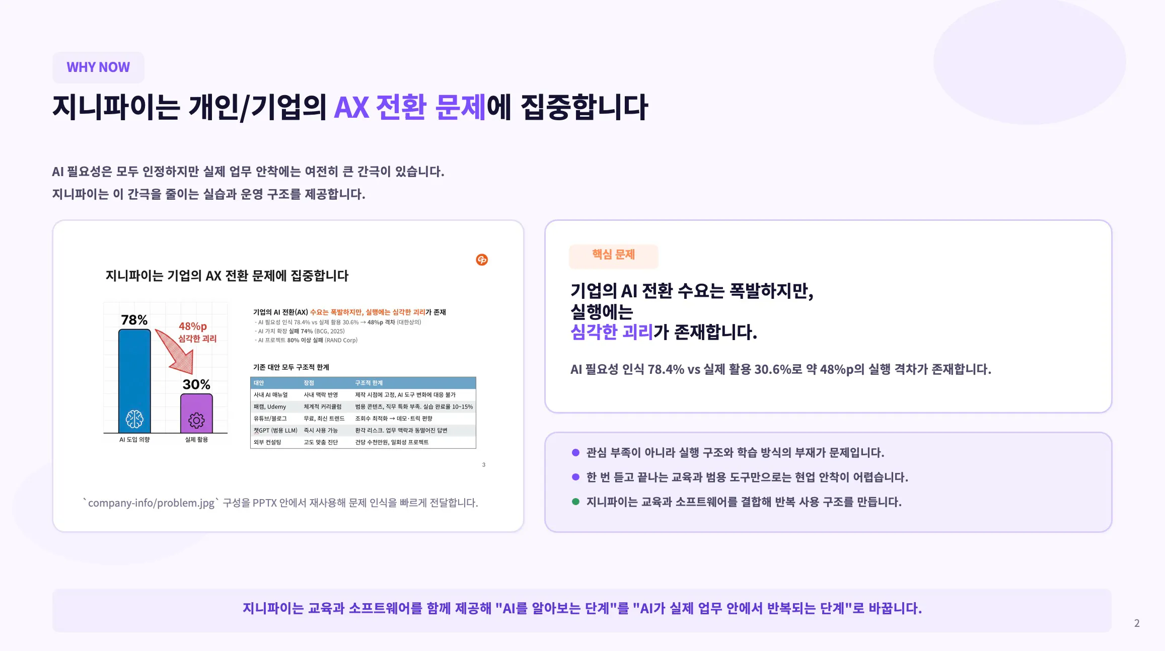 B2B 교육 제안이나 정부과제 제안을 할 때마다 비슷하지만 내용이 조금씩 다른 슬라이드를 만들어야 했다. 회사 소개, 문제 정의, 제공 서비스 구성은 매번 비슷한데, 제안 대상에 따라 강조점이 달라지니 매번 수동으로 수정하고 있었다.