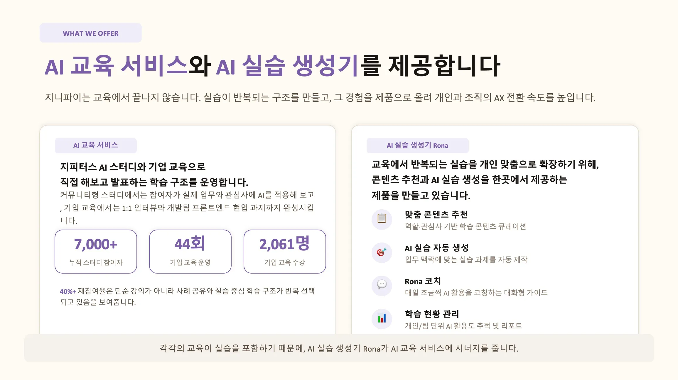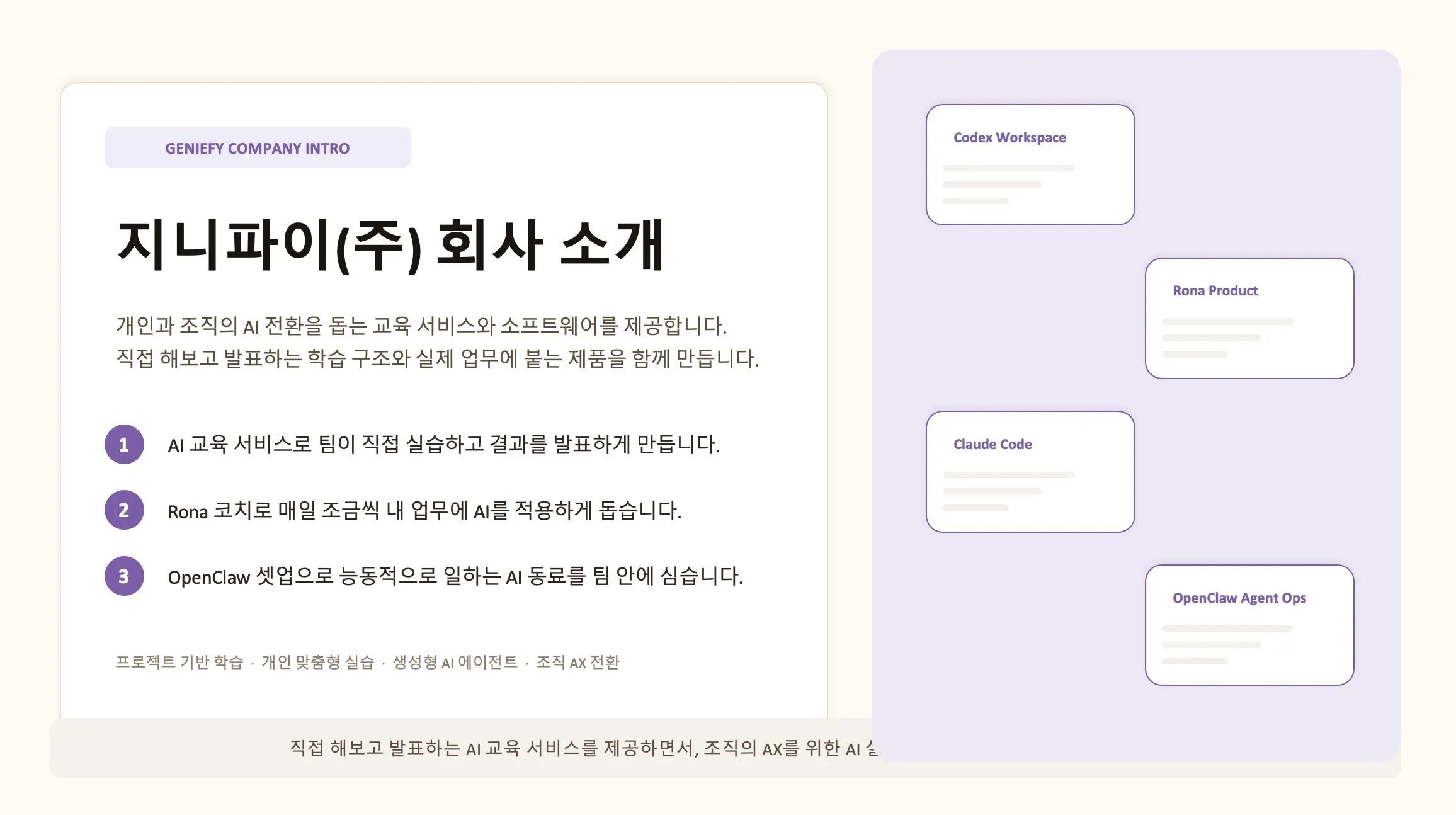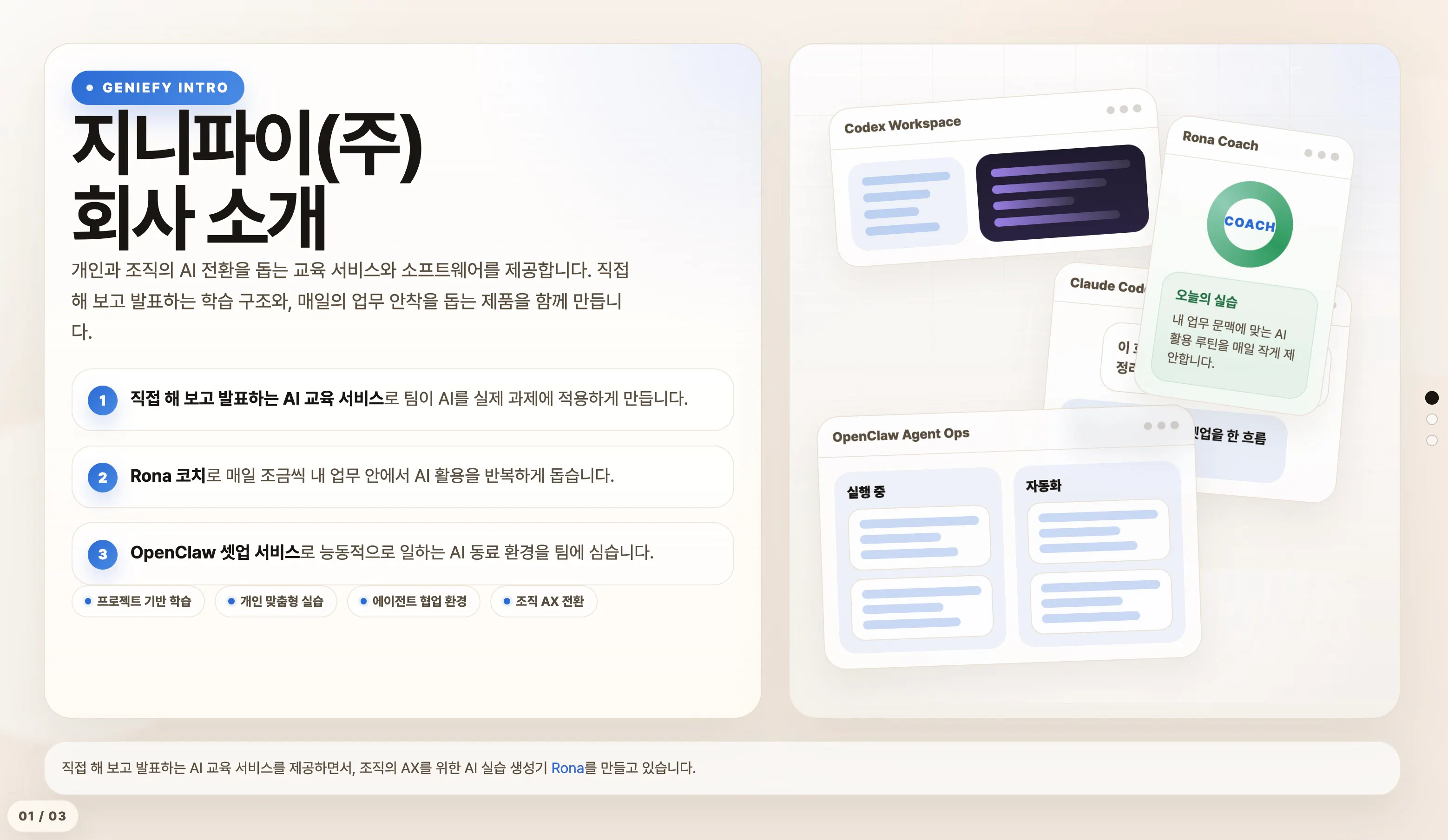 B2B 교육 제안이나 정부과제 제안을 할 때마다 비슷하지만 내용이 조금씩 다른 슬라이드를 만들어야 했다. 회사 소개, 문제 정의, 제공 서비스 구성은 매번 비슷한데, 제안 대상에 따라 강조점이 달라지니 매번 수동으로 수정하고 있었다.