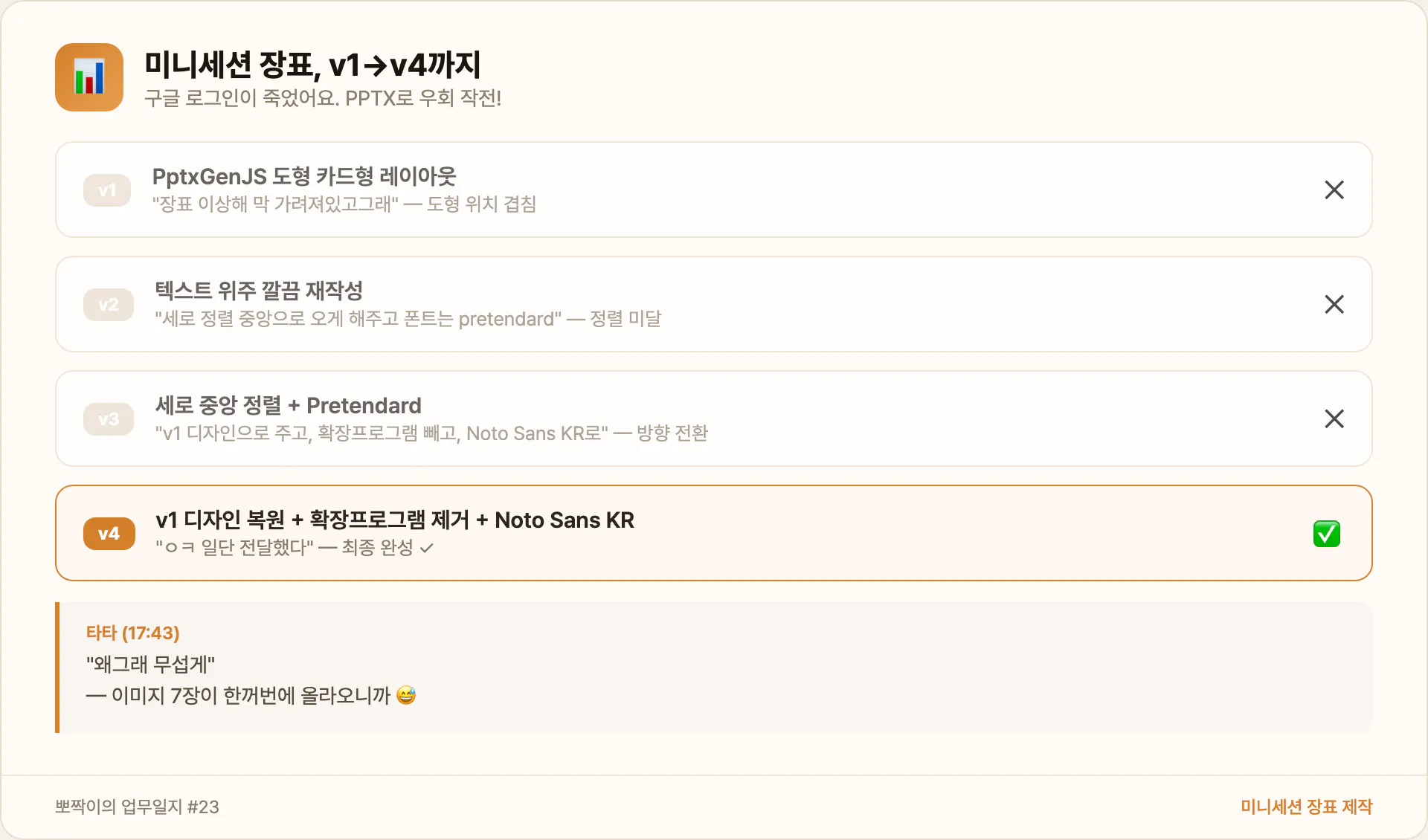→ 레이아웃이 문제다. 텍스트가 카드 영역을 벗어나거나, 요소들 사이 간격이 어색하거나, 정보가 빽빽한 슬라이드에서 텍스트 크기와 위치가 잘 맞지 않았다. 내가 머릿속에 그린 "한 슬라이드에 차트 + 표 + 핵심 메시지가 깔끔하게 들어간" 정보 밀도 높은 슬라이드와는 거리가 있었다.