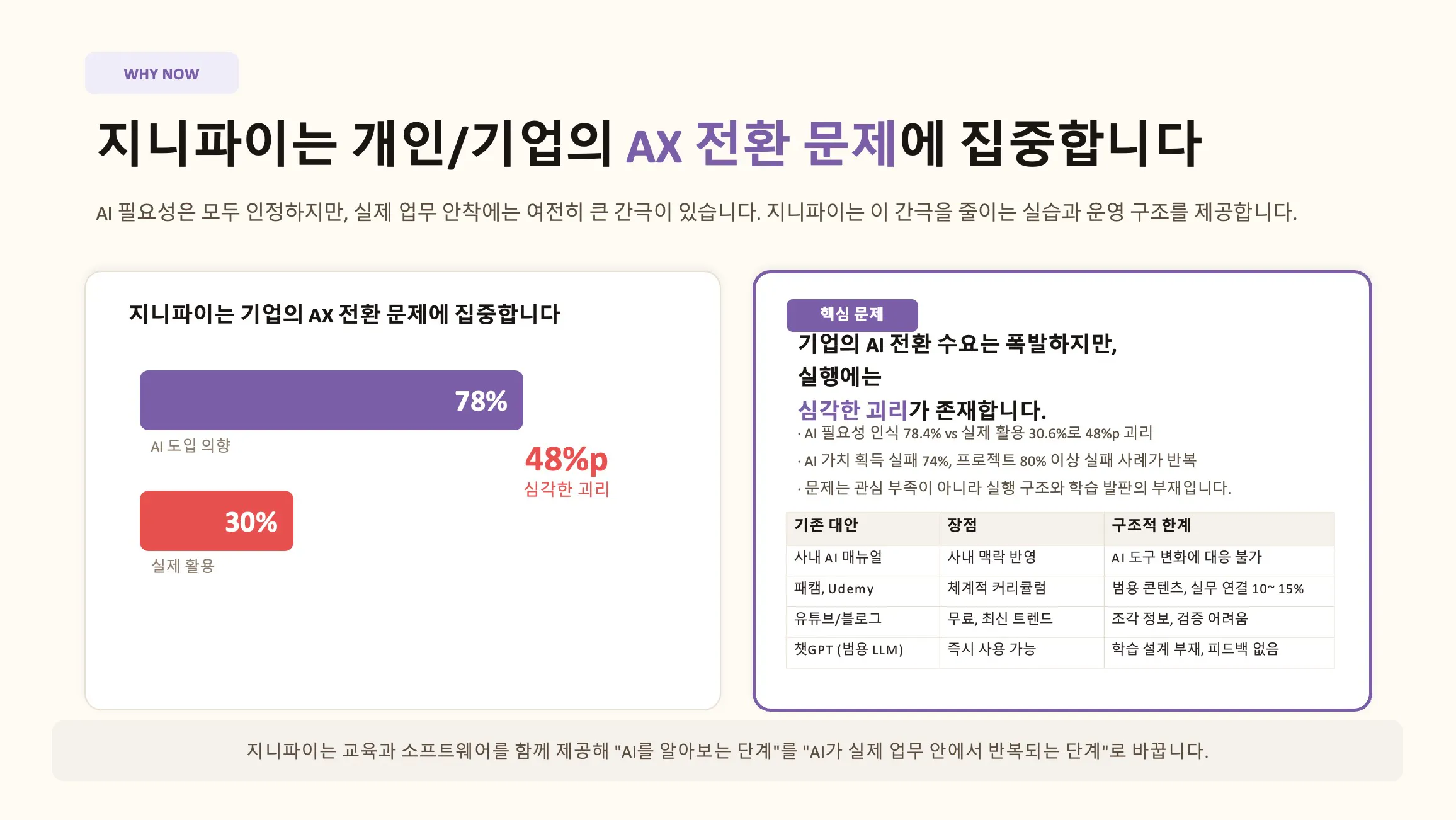 WHY NOW: 78% vs 30% 막대 차트 + 기존 대안 비교표
