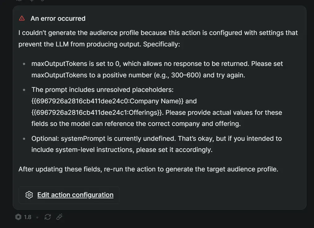 "I couldn't generate the audience profile because this action is configured with settings that prevent the LLM from producing output."