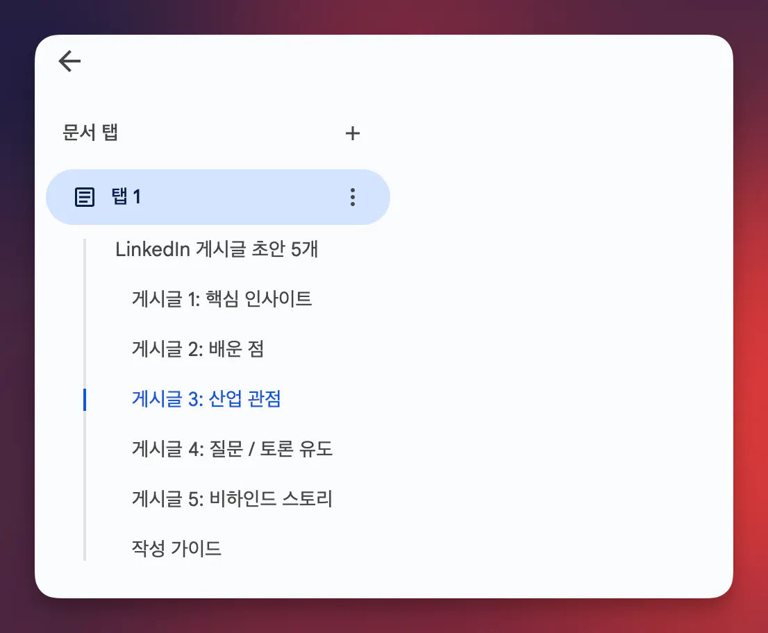 4. 콘텐츠 생성 (핵심!): 회의 내용을 바탕으로 외부 공유용 링크드인 초안 5개를 별도 문서로 작성합니다. 이때 1단계에서 만든 프롬프트를 사용합니다.