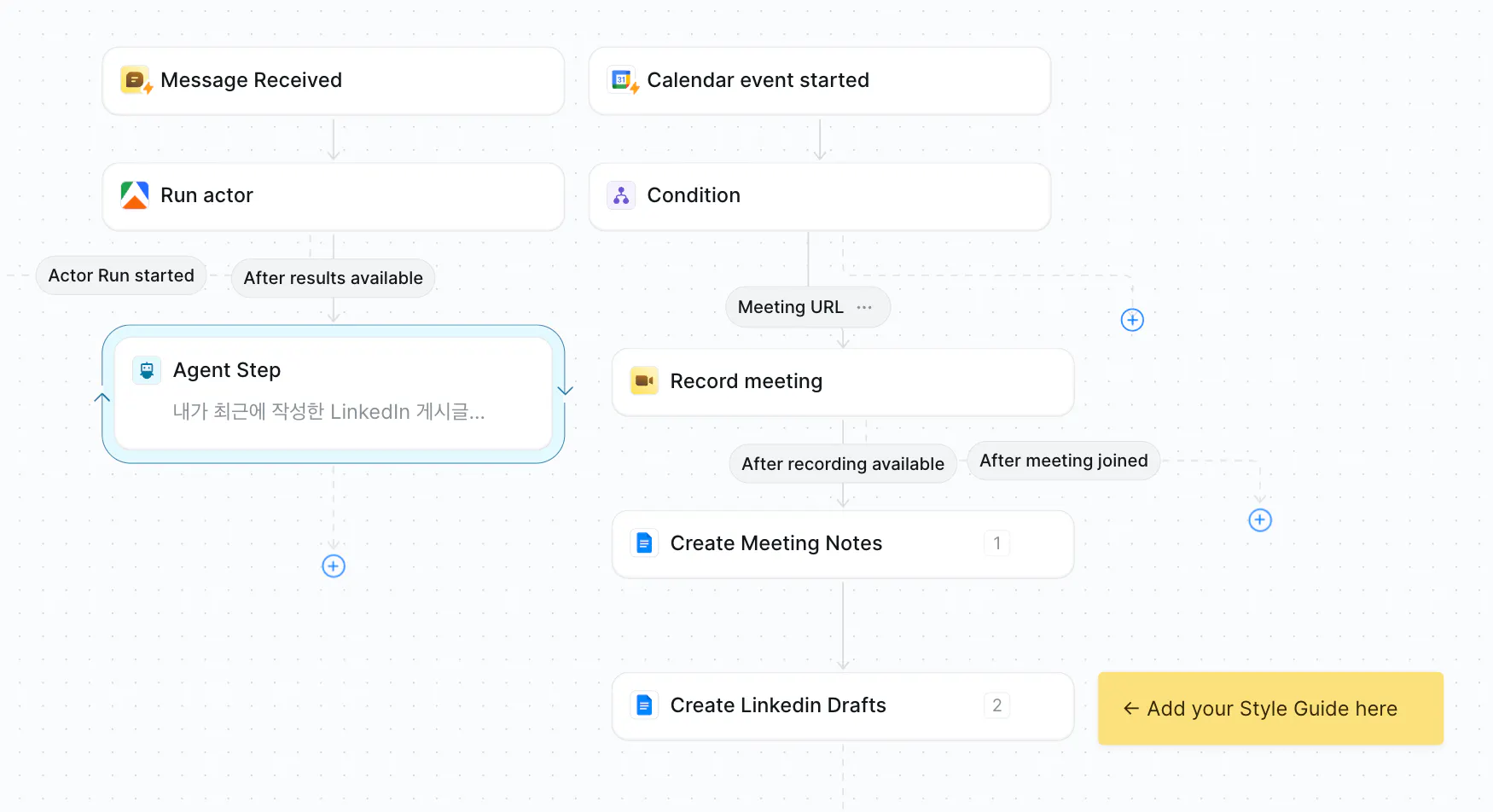 1. 트리거: 구글 캘린더 일정 중, the meeting includes a meeting URL 이라는 조건을 충족하면 Lindy가 자동으로 깨어납니다.