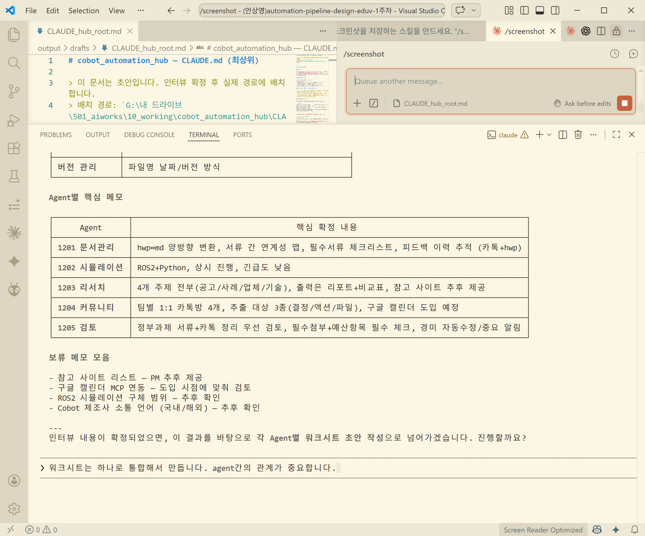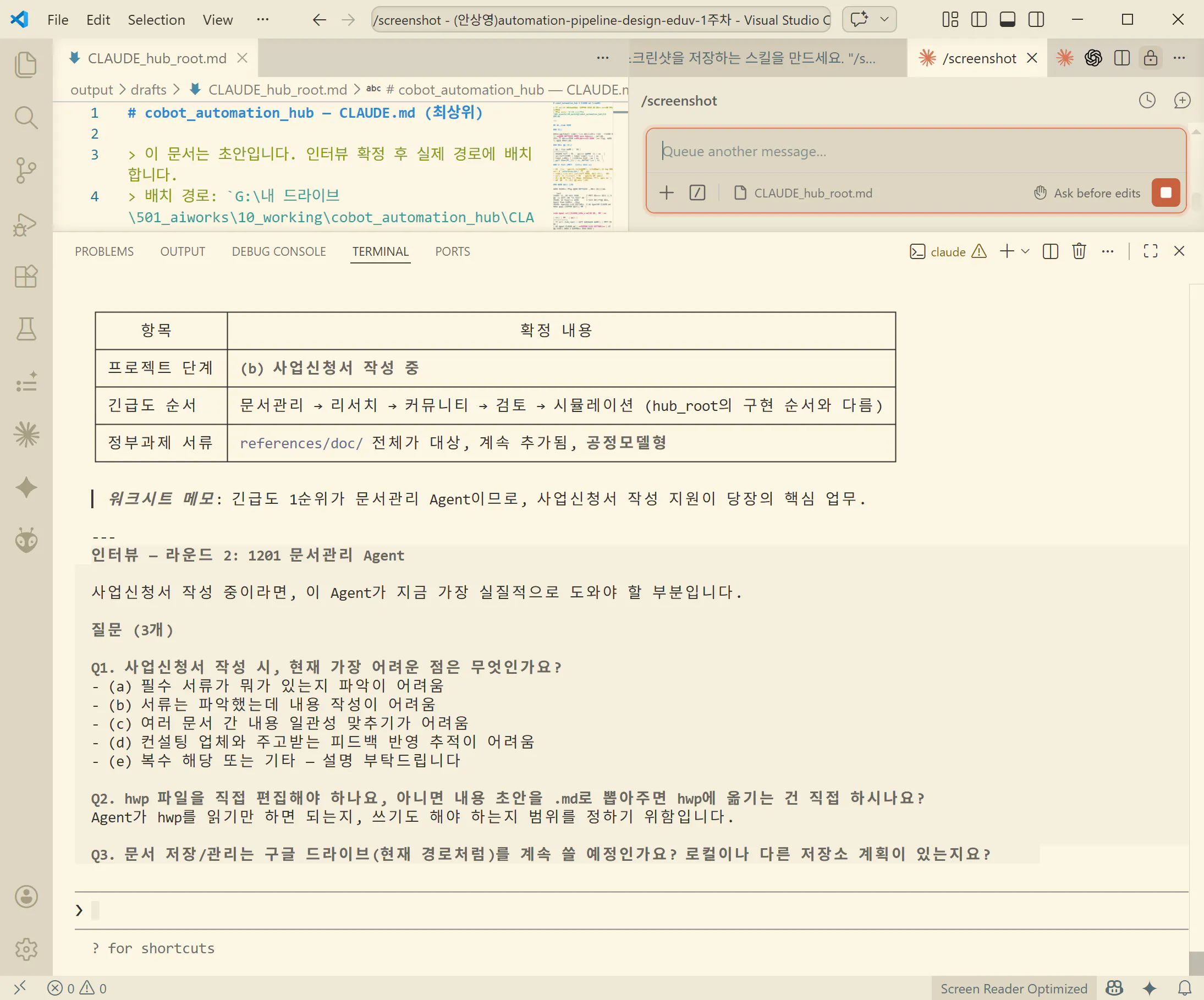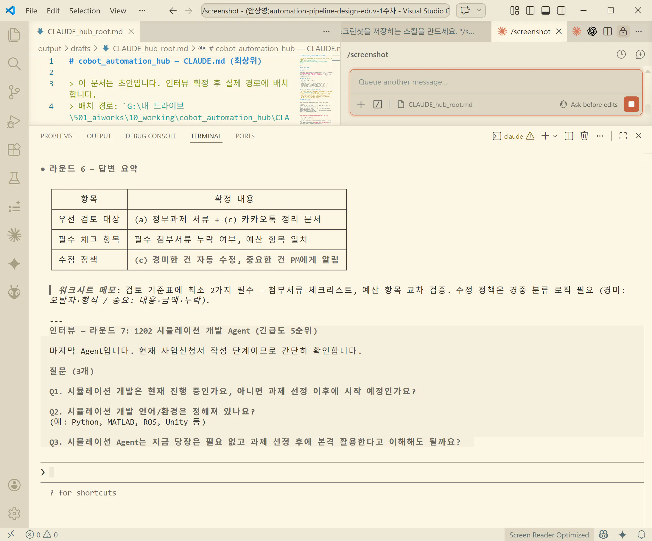 안상영 강사님이 제공한 업무정의-자동화-위임설계서-인터뷰 문서를 기초로, Claude Code와 질문형 인터뷰를 진행했습니다.