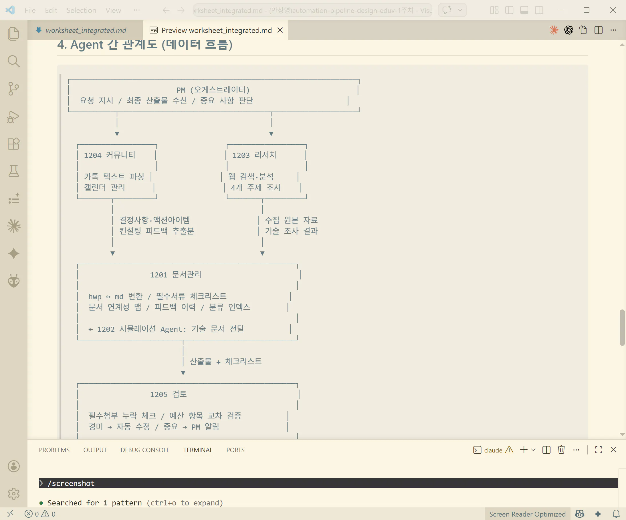 파이프라인 간 겹침 발견: 커뮤니티 Agent와 문서관리 Agent가 카카오톡이라는 입력 소스가 겹치는 것을 인터뷰 중 발견 → 커뮤니티 Agent가 파싱하고 문서관리 Agent에 전달하는 흐름으로 정리했습니다.