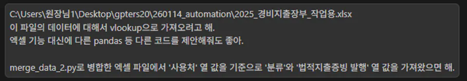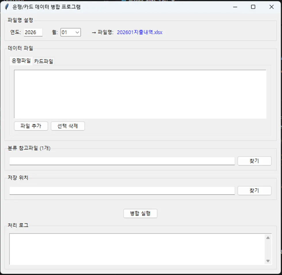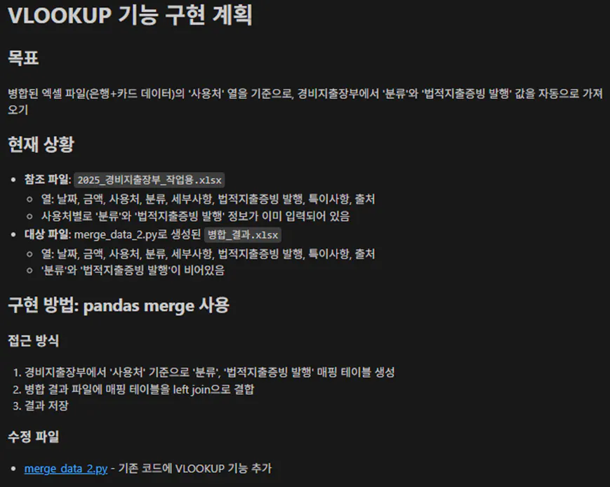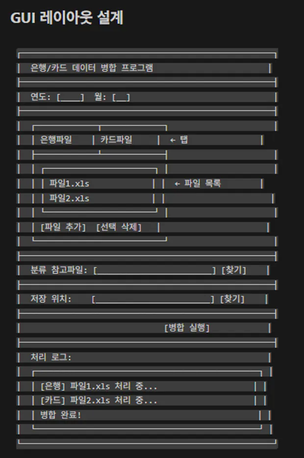역시 클로드코드에게 연도/월, 파일 업로드, 분류 참고파일, 저장위치를 입력받아서, 통합 -> 열 가져오기 작업까지 하게끔 요청했다. 클로드는 작업 진행 전 GUI 설계를 미리 공유해주었다.