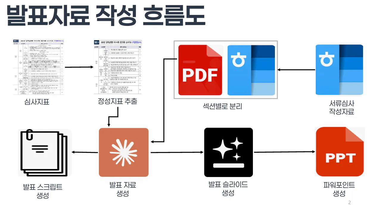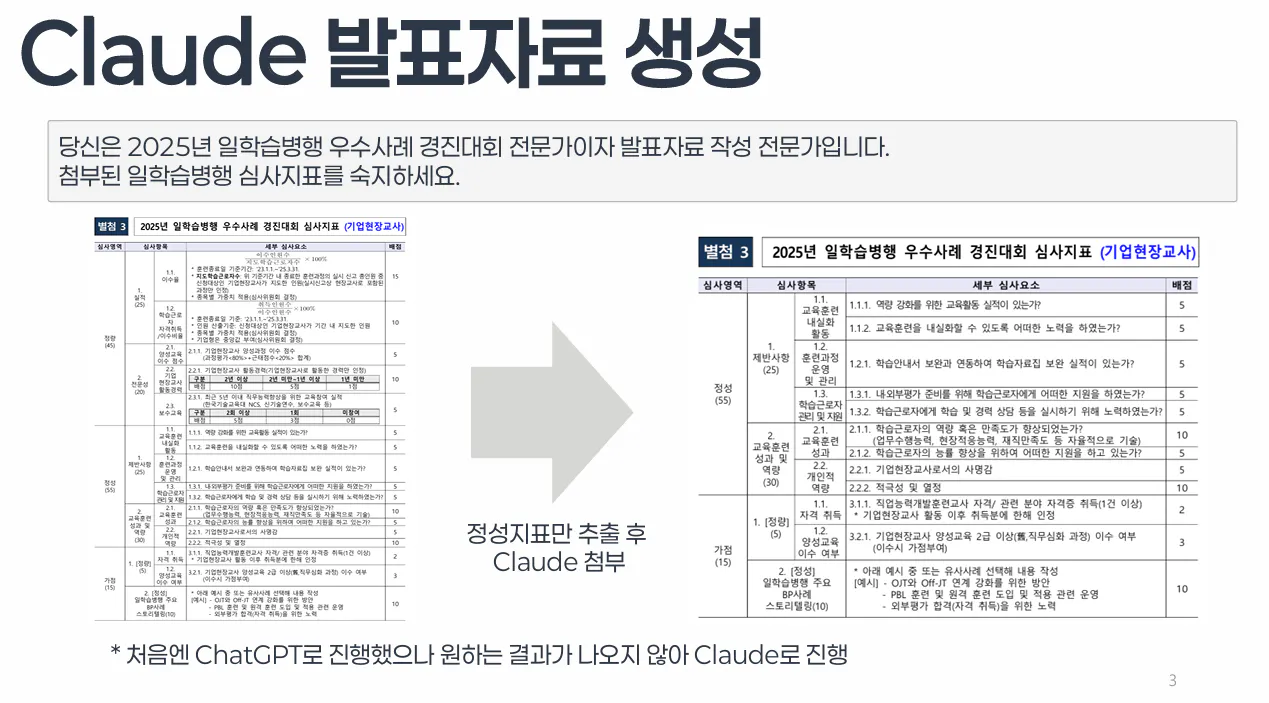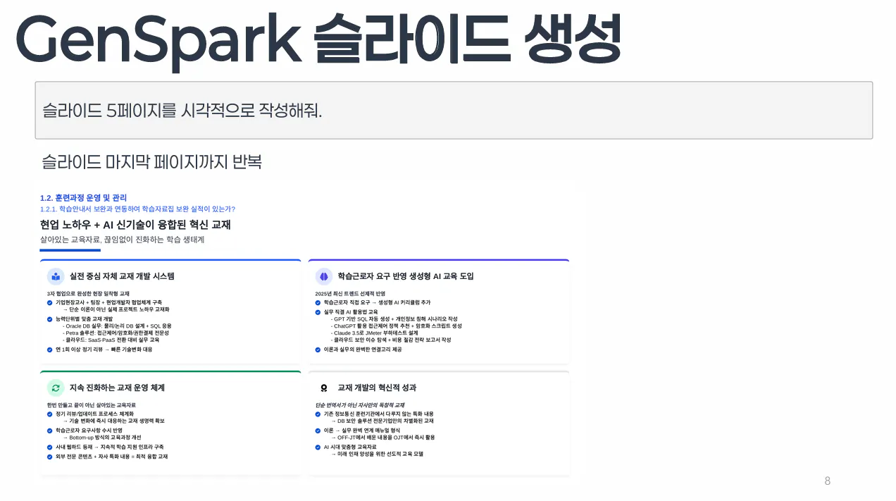 일학습병행 우수사례 경진대회 서류 심사에서 입상하여 발표 기회를 얻게 되었다. 발표자료를 준비하는 과정에서 발표자료를 AI로 제작해 보았다. 처음에는 Gamma를 활용했지만, 결과물이 강의 교안에 가까워 만족스럽지 않았다. 두 번째로 Napkin을 사용해 도형 중심의 구성을 시도했으나, 글자를 추가할 때마다 번거로움이 있었다. 최종적으로 GenSpark을 시험해 본 결과 마음에 들어, 발표자료는 GenSpark으로 제작하기로 결정했다.
