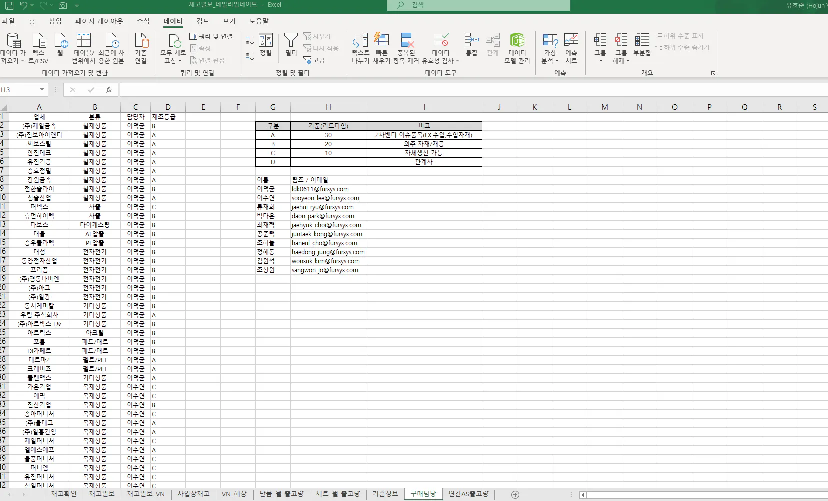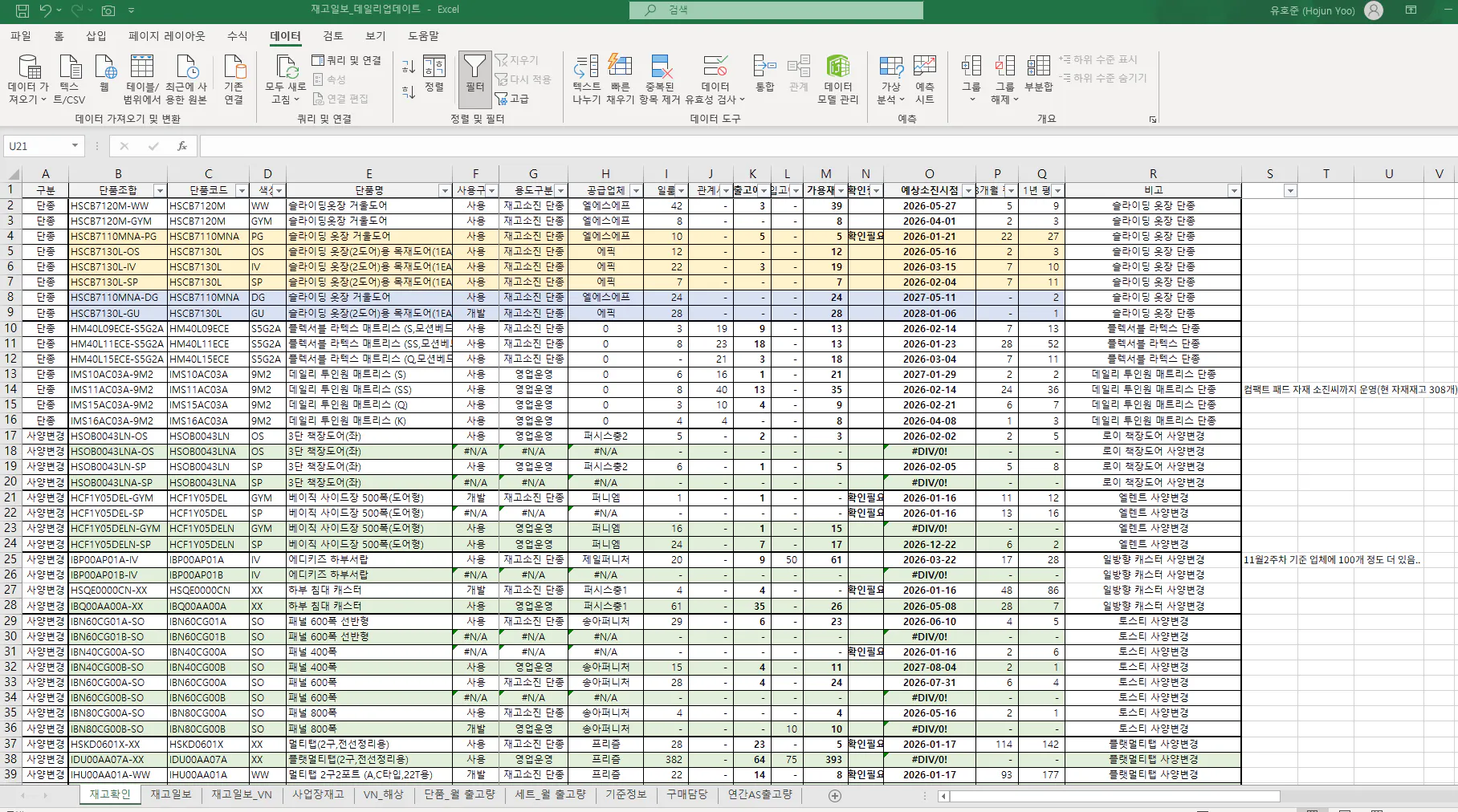 제가 별도로 회사 RAW데이터 가공하여 관리하는 엑셀 데이터가 있습니다.