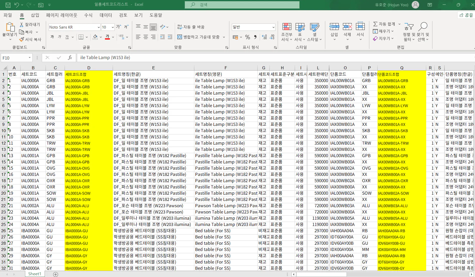 예를 들어 A측판이 단종되면, 이 측판을 사용하는 모든 책상/장 등의 세트 코드를 찾아서 정리하고 있음