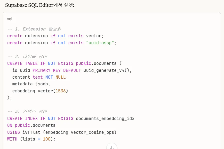 content text not null, -- Vector Store가 사용하는 컬럼명