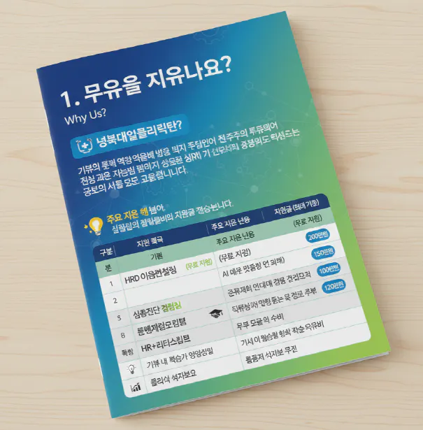 QR 코드: 리플렛 하단에 HRD4U 신청 페이지로 바로 연결되는 QR코드를 삽입하면 접근성을 높일 수 있습니다.