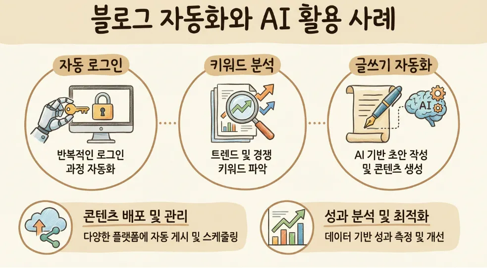 • 아이프레임(iframe) 돌파: 블로그 글쓰기 창의 특수한 프레임 구조를 AI와 함께 분석하여 제목과 본문 입력 칸을 정확히 찾아냈습니다.