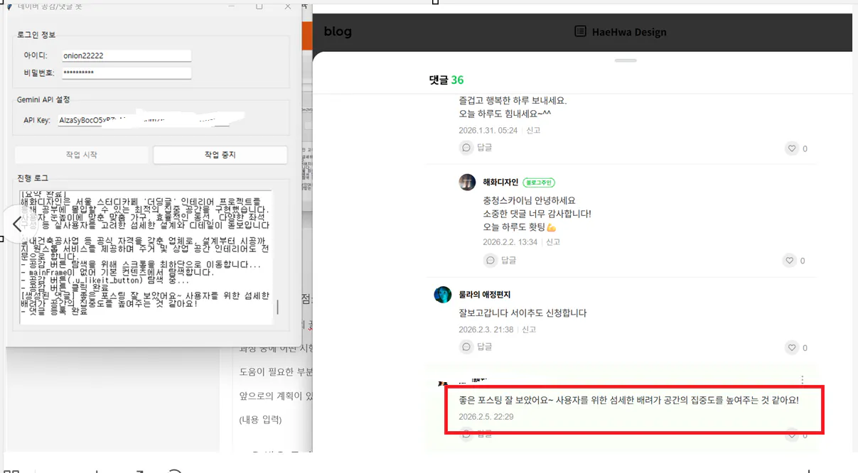 • 공감 댓글 프로그램: 단순히 댓글만 다는 게 아니라, 글의 맥락을 읽고 맞춤형 댓글을 작성해 주는 점이 아주 인상적이었습니다. 속도와 퀄리티 모두 만족스러웠습니다.