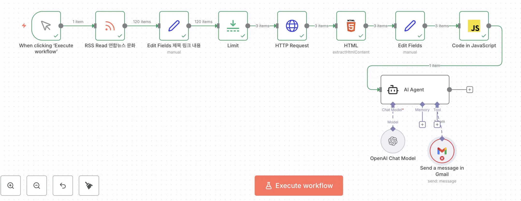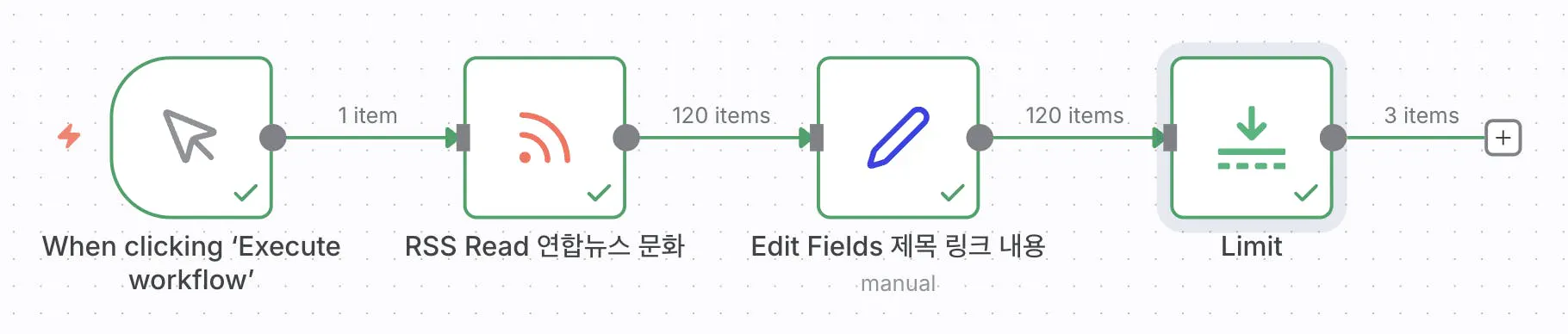 워크플로우를 실행시키면 문화면 뉴스를 가져오는 자동화인데요, 우선 노드를 이렇게 붙였습니다.