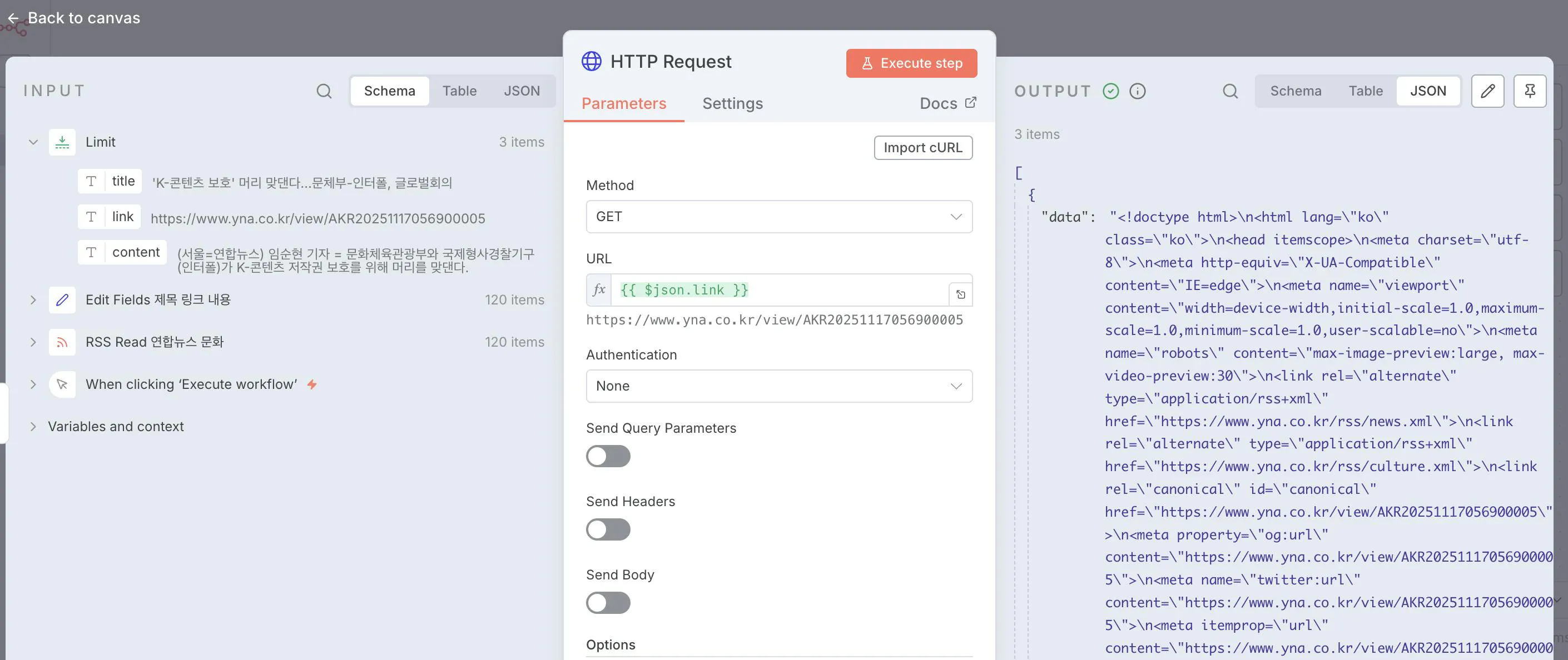 다음 순서는 HTTP 를 가져와서 제목과 내용을 따로 모아보는 것이었습니다. 바로 HTML 을 가져오면 될 것 같은데 바로 전 단계에서는 Edit Fields 노드를 왜 썼는지 궁금하네요! (질문1)