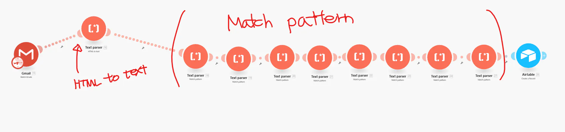 > "html 메일날라오는거 make에서 mailhook을 이용하시면 되고요. 그 파싱하는 것은 o3 모델에게 html 로 파싱해서 정규표현식으로 뽑아달라고 해서 원하시는 값만 싹싹 드시면 충분히 자동화 해보실 수 있을 것 입니다."