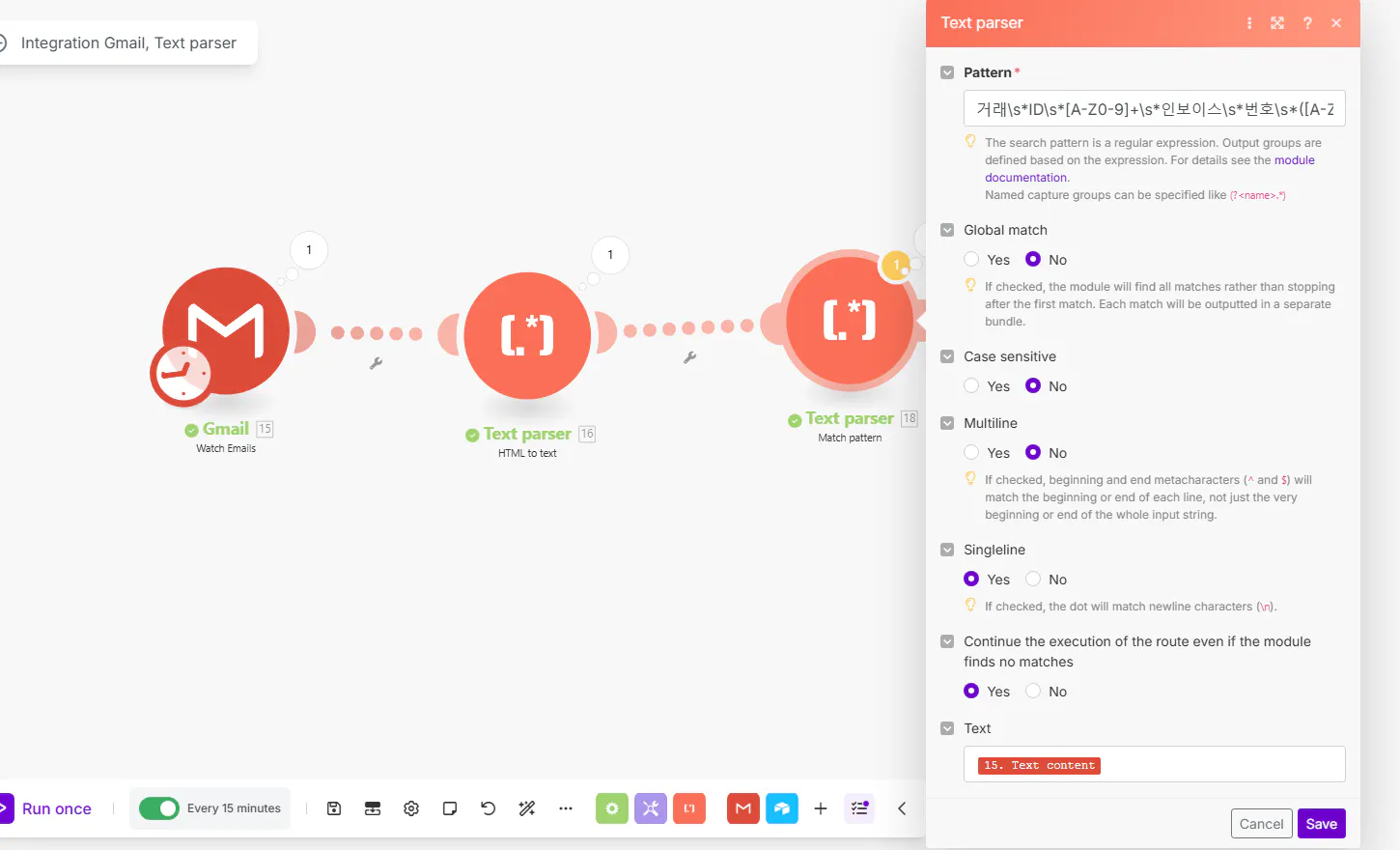 Pattern →인보이스 번호\s*([A-Za-z0-9-]+)Text parser #2