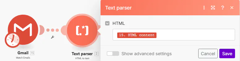 Gmail 모듈: “New E-mail” 트리거, 메일 데이터를 불러옴
