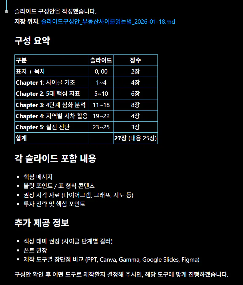claude code는 제사한 제작도구 PPT, Canva, Gamma, Google Slides, Figma 중 선택하며 최적화 해주겠다고 하였지만 개인적으로 사용자 지정한 템플릿을 이용하여 genspark에서 제작해 보고 싶어서 genspark에 최적화된 슬라이드 구성안을 요청함.