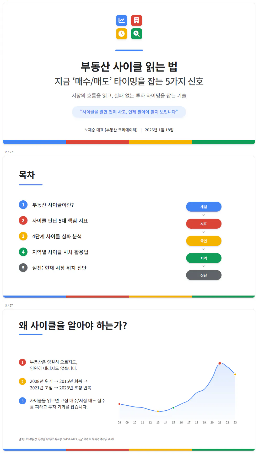 추천받은 활용 예시 중 Part 2 거시경제 활용 부분에서 '부동산 싸이클 읽는 법'을 선택해 vip 고객과 초보 공인중개사를 위한 온라인 강좌 교육자료를 생성함.