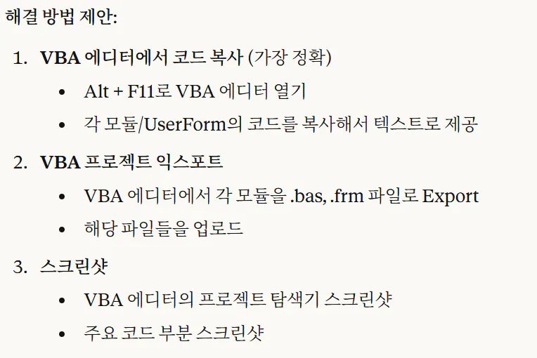 가장 먼저 시도해 본 것은 VBA 파일을 그대로 Claude에 업로드 하고 분석 및 데이터 수정을 요청하는 것이었습니다.
